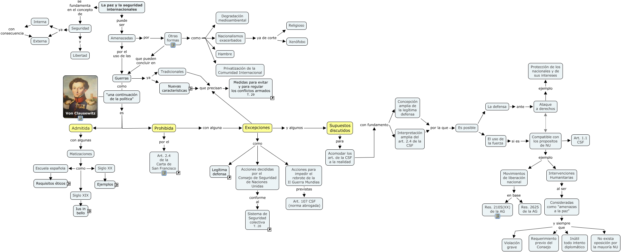 Este Cmap, tiene información relacionada con: La prohibicion del uso de la fuerza_introduccion, Consideradas como "amenazas a la paz" y siempre que Requerimiento previo del Consejo, El uso de la fuerza si es Compatible con los propositos de NU, Acomodar los art. de la CSF a la realidad con fundamento Concepción amplia de la legítima defensa, "una continuación de la política" es Prohibida, Amenazadas por Otras formas, Requisitos éticos debe ser Ante una violación del Derecho, Compatible con los propositos de NU ejemplo Movimientos de liberación nacional, Acciones para impedir el rebrote de la II Guerra Mundias previstas Art. 107 CSF (norma abrogada), Interna con consecuencia Externa, La paz y la seguridad internacionales puede ser Amenazadas, Normas para evitar "daños innecesarios" no se aplican Guerras coloniales, Amenazadas por el uso de las Guerras, Normas para evitar "daños innecesarios" aplicable solo Naciones civilizadas, Nacionalismos exacerbados ya de corte Xenófobo, Seguridad ya Externa, Ataque a derechos ejemplo Protección de los nacionales y de sus intereses, Guerras como "una continuación de la política", Compatible con los propositos de NU Art. 1.1 CSF, Seguridad ya Interna, Supuestos discutidos para Acomodar los art. de la CSF a la realidad