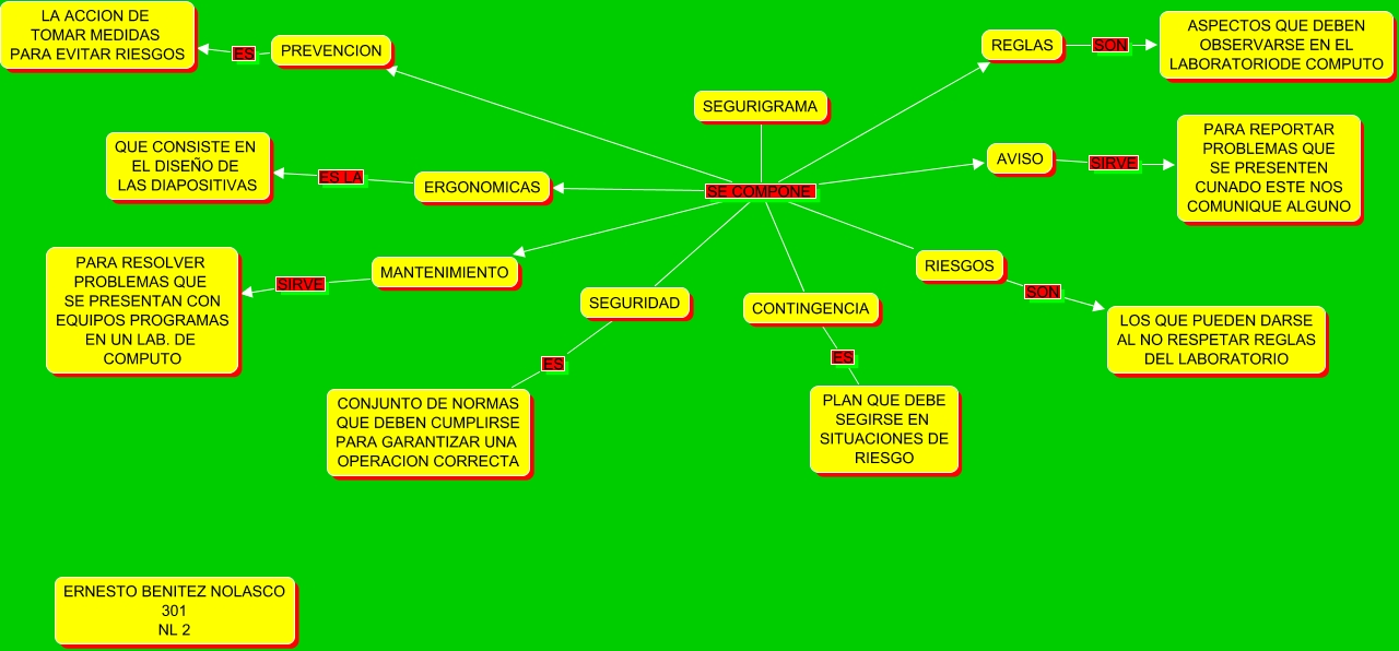 Este Cmap, tiene información relacionada con: mixx, PREVENCION ES LA ACCION DE TOMAR MEDIDAS PARA EVITAR RIESGOS, CONTINGENCIA ES PLAN QUE DEBE SEGIRSE EN SITUACIONES DE RIESGO, SEGURIGRAMA SE COMPONE ERGONOMICAS, ERGONOMICAS ES LA QUE CONSISTE EN EL DISEÑO DE LAS DIAPOSITIVAS, SEGURIGRAMA SE COMPONE SEGURIDAD, RIESGOS SON LOS QUE PUEDEN DARSE AL NO RESPETAR REGLAS DEL LABORATORIO, SEGURIDAD ES CONJUNTO DE NORMAS QUE DEBEN CUMPLIRSE PARA GARANTIZAR UNA OPERACION CORRECTA, SEGURIGRAMA SE COMPONE CONTINGENCIA, SEGURIGRAMA SE COMPONE PREVENCION, AVISO SIRVE PARA REPORTAR PROBLEMAS QUE SE PRESENTEN CUNADO ESTE NOS COMUNIQUE ALGUNO, REGLAS SON ASPECTOS QUE DEBEN OBSERVARSE EN EL LABORATORIODE COMPUTO, MANTENIMIENTO SIRVE PARA RESOLVER PROBLEMAS QUE SE PRESENTAN CON EQUIPOS PROGRAMAS EN UN LAB. DE COMPUTO, SEGURIGRAMA SE COMPONE MANTENIMIENTO, SEGURIGRAMA SE COMPONE REGLAS, SEGURIGRAMA SE COMPONE RIESGOS, SEGURIGRAMA SE COMPONE AVISO