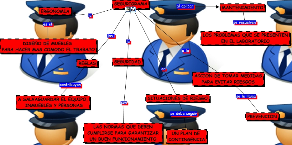This Concept Map, created with IHMC CmapTools, has information related to: dnl seguridad, ACCION DE TOMAR MEDIDAS PARA EVITAR RIESGOS se le llama PREVENCION, MANTENIMIENTO se resuelven LOS PROBLEMAS QUE SE PRESENTEN EN EL LABORATORIO, SEGURIGRAMA las REGLAS, SEGURIGRAMA la ERGONOMIA, ERGONOMIA es el DISEÑO DE MUEBLES PARA HACER MAS COMODO EL TRABAJO, SEGURIGRAMA a la ACCION DE TOMAR MEDIDAS PARA EVITAR RIESGOS, SEGURIGRAMA la SEGURIDAD, SEGURIGRAMA al aplicar MANTENIMIENTO, REGLAS contribuyen A SALVAGUARDAR EL EQUIPO, INMUEBLES Y PERSONAS, SITUACIONES DE RIESGO se debe seguir UN PLAN DE CONTINGENCIA, SEGURIDAD son LAS NORMAS QUE DEBEN CUMPLIRSE PARA GARANTIZAR UN BUEN FUNCIONAMIENTO, SEGURIGRAMA en SITUACIONES DE RIESGO