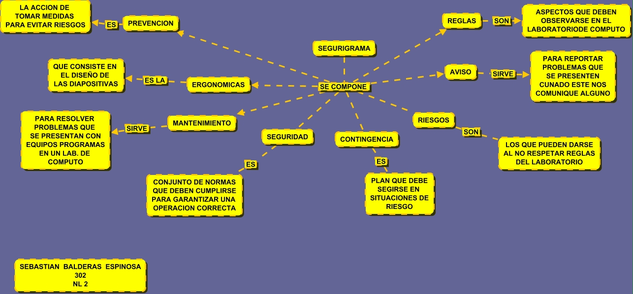 Este Cmap, tiene información relacionada con: CEGURIGRAMA SEBASTIAN BALDERAS ESPINOSA, CONTINGENCIA ES PLAN QUE DEBE SEGIRSE EN SITUACIONES DE RIESGO, PREVENCION ES LA ACCION DE TOMAR MEDIDAS PARA EVITAR RIESGOS, ERGONOMICAS ES LA QUE CONSISTE EN EL DISEÑO DE LAS DIAPOSITIVAS, SEGURIGRAMA SE COMPONE ERGONOMICAS, SEGURIDAD ES CONJUNTO DE NORMAS QUE DEBEN CUMPLIRSE PARA GARANTIZAR UNA OPERACION CORRECTA, RIESGOS SON LOS QUE PUEDEN DARSE AL NO RESPETAR REGLAS DEL LABORATORIO, SEGURIGRAMA SE COMPONE SEGURIDAD, SEGURIGRAMA SE COMPONE CONTINGENCIA, SEGURIGRAMA SE COMPONE PREVENCION, REGLAS SON ASPECTOS QUE DEBEN OBSERVARSE EN EL LABORATORIODE COMPUTO, AVISO SIRVE PARA REPORTAR PROBLEMAS QUE SE PRESENTEN CUNADO ESTE NOS COMUNIQUE ALGUNO, MANTENIMIENTO SIRVE PARA RESOLVER PROBLEMAS QUE SE PRESENTAN CON EQUIPOS PROGRAMAS EN UN LAB. DE COMPUTO, SEGURIGRAMA SE COMPONE MANTENIMIENTO, SEGURIGRAMA SE COMPONE AVISO, SEGURIGRAMA SE COMPONE RIESGOS, SEGURIGRAMA SE COMPONE REGLAS