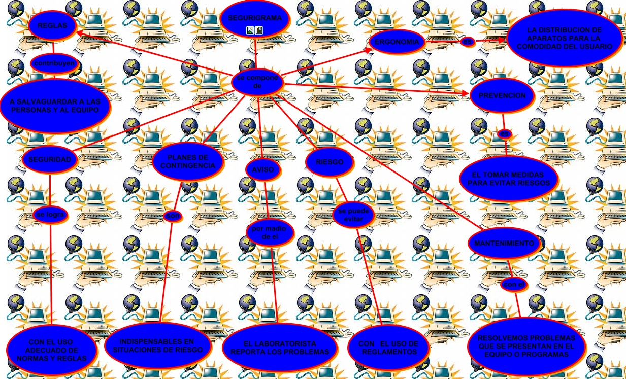 Este Cmap, tiene información relacionada con: SEGURIGRAMA, PREVENCION es EL TOMAR MEDIDAS PARA EVITAR RIESGOS, SEGURIGRAMA se compone de REGLAS, AVISO por madio de el EL LABORATORISTA REPORTA LOS PROBLEMAS, SEGURIGRAMA se compone de ERGONOMIA, MANTENIMIENTO con el RESOLVEMOS PROBLEMAS QUE SE PRESENTAN EN EL EQUIPO O PROGRAMAS, SEGURIGRAMA se compone de AVISO, SEGURIGRAMA se compone de PLANES DE CONTINGENCIA, SEGURIGRAMA se compone de MANTENIMIENTO, SEGURIGRAMA se compone de RIESGO, ERGONOMIA es LA DISTRIBUCION DE APARATOS PARA LA COMODIDAD DEL USUARIO, SEGURIDAD se logra CON EL USO ADECUADO DE NORMAS Y REGLAS, PLANES DE CONTINGENCIA son INDISPENSABLES EN SITUACIONES DE RIESGO, SEGURIGRAMA se compone de SEGURIDAD, SEGURIGRAMA se compone de PREVENCION, RIESGO se puede evitar CON EL USO DE REGLAMENTOS, REGLAS contribuyen A SALVAGUARDAR A LAS PERSONAS Y AL EQUIPO