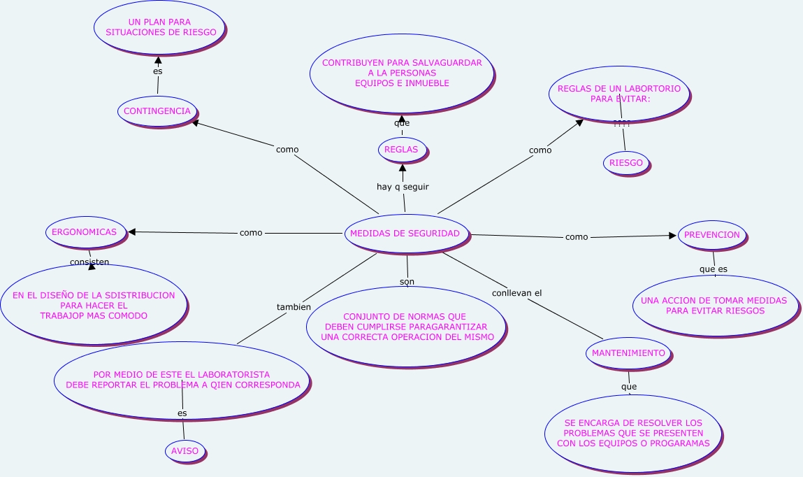 Este Cmap, tiene información relacionada con: SEGURIGRAMA, ERGONOMICAS consisten EN EL DISEÑO DE LA SDISTRIBUCION PARA HACER EL TRABAJOP MAS COMODO, POR MEDIO DE ESTE EL LABORATORISTA DEBE REPORTAR EL PROBLEMA A QIEN CORRESPONDA es AVISO, MEDIDAS DE SEGURIDAD tambien POR MEDIO DE ESTE EL LABORATORISTA DEBE REPORTAR EL PROBLEMA A QIEN CORRESPONDA, MEDIDAS DE SEGURIDAD como REGLAS DE UN LABORTORIO PARA EVITAR:, MEDIDAS DE SEGURIDAD como ERGONOMICAS, MANTENIMIENTO que SE ENCARGA DE RESOLVER LOS PROBLEMAS QUE SE PRESENTEN CON LOS EQUIPOS O PROGARAMAS, CONTINGENCIA es UN PLAN PARA SITUACIONES DE RIESGO, MEDIDAS DE SEGURIDAD como CONTINGENCIA, MEDIDAS DE SEGURIDAD como PREVENCION, MEDIDAS DE SEGURIDAD son CONJUNTO DE NORMAS QUE DEBEN CUMPLIRSE PARAGARANTIZAR UNA CORRECTA OPERACION DEL MISMO, MEDIDAS DE SEGURIDAD conllevan el MANTENIMIENTO, PREVENCION que es UNA ACCION DE TOMAR MEDIDAS PARA EVITAR RIESGOS, REGLAS que CONTRIBUYEN PARA SALVAGUARDAR A LA PERSONAS EQUIPOS E INMUEBLE, REGLAS DE UN LABORTORIO PARA EVITAR: ???? RIESGO, MEDIDAS DE SEGURIDAD hay q seguir REGLAS