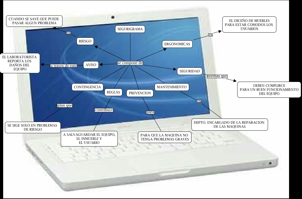Este Cmap, tiene información relacionada con: CRISTOBAL VAZQUEZ GARCIA, SEGURIGRAMA se compone de SEGURIDAD, SEGURIGRAMA se compone de RIESGO, SEGURIGRAMA se compone de MANTENIMIENTO, ERGONOMICAS es EL DICEÑO DE MUEBLES PARA ESTAR COMODOS LOS USUARIOS, MANTENIMIENTO es DEPTO. ENCARGADO DE LA REPARACION DE LAS MAQUINAS, PREVENCION para PARA QUE LA MAQUINA NO TENGA PROBLEMAS GRAVES, SEGURIGRAMA se compone de PREVENCION, RIESGO es CUANDO SE SAVE QUE PUEDE PASAR ALGUN PROBLEMA, CONTINGENCIA plan que SE SIGE SOLO EN PROBLEMAS DE RIESGO, AVISO a traves de este EL LABORATORISTA REPORTA LOS DAÑOS DEL EQUIPO, SEGURIDAD normas que DEBEN CUMPLIRCE PARA UN BUEN FUNCIONAMIENTO DEL EQUIPO, SEGURIGRAMA se compone de REGLAS, SEGURIGRAMA se compone de ERGONOMICAS, SEGURIGRAMA se compone de CONTINGENCIA, SEGURIGRAMA se compone de AVISO, REGLAS contribuye A SALVAGUARDAR EL EQUIPO, EL INMUEBLE Y EL USUARIO