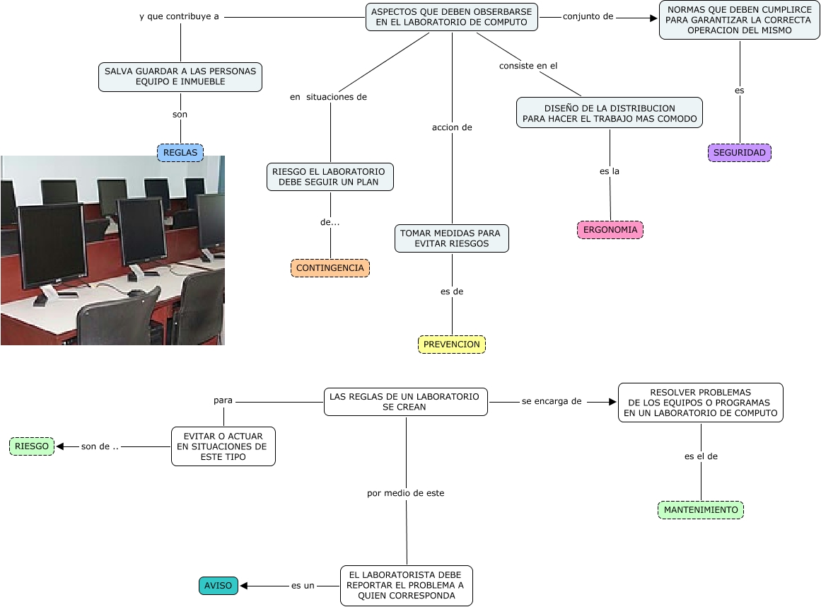 Este Cmap, tiene información relacionada con: preservar equipo de computo-mariel bautista lobato, RESOLVER PROBLEMAS DE LOS EQUIPOS O PROGRAMAS EN UN LABORATORIO DE COMPUTO es el de MANTENIMIENTO, ASPECTOS QUE DEBEN OBSERBARSE EN EL LABORATORIO DE COMPUTO accion de TOMAR MEDIDAS PARA EVITAR RIESGOS, ASPECTOS QUE DEBEN OBSERBARSE EN EL LABORATORIO DE COMPUTO conjunto de NORMAS QUE DEBEN CUMPLIRCE PARA GARANTIZAR LA CORRECTA OPERACION DEL MISMO, ASPECTOS QUE DEBEN OBSERBARSE EN EL LABORATORIO DE COMPUTO y que contribuye a SALVA GUARDAR A LAS PERSONAS EQUIPO E INMUEBLE, EL LABORATORISTA DEBE REPORTAR EL PROBLEMA A QUIEN CORRESPONDA es un AVISO, NORMAS QUE DEBEN CUMPLIRCE PARA GARANTIZAR LA CORRECTA OPERACION DEL MISMO es SEGURIDAD, SALVA GUARDAR A LAS PERSONAS EQUIPO E INMUEBLE son REGLAS, ASPECTOS QUE DEBEN OBSERBARSE EN EL LABORATORIO DE COMPUTO en situaciones de RIESGO EL LABORATORIO DEBE SEGUIR UN PLAN, LAS REGLAS DE UN LABORATORIO SE CREAN para EVITAR O ACTUAR EN SITUACIONES DE ESTE TIPO, RIESGO EL LABORATORIO DEBE SEGUIR UN PLAN de... CONTINGENCIA, ASPECTOS QUE DEBEN OBSERBARSE EN EL LABORATORIO DE COMPUTO consiste en el DISEÑO DE LA DISTRIBUCION PARA HACER EL TRABAJO MAS COMODO, TOMAR MEDIDAS PARA EVITAR RIESGOS es de PREVENCION, LAS REGLAS DE UN LABORATORIO SE CREAN por medio de este EL LABORATORISTA DEBE REPORTAR EL PROBLEMA A QUIEN CORRESPONDA, DISEÑO DE LA DISTRIBUCION PARA HACER EL TRABAJO MAS COMODO es la ERGONOMIA, LAS REGLAS DE UN LABORATORIO SE CREAN se encarga de RESOLVER PROBLEMAS DE LOS EQUIPOS O PROGRAMAS EN UN LABORATORIO DE COMPUTO, EVITAR O ACTUAR EN SITUACIONES DE ESTE TIPO son de .. RIESGO
