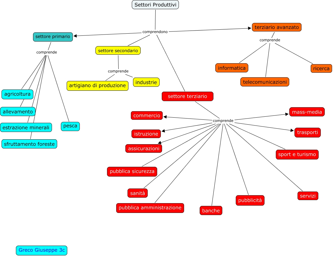 Questa Cmap, creata con IHMC CmapTools, contiene informazioni relative a: mappa settori Giuseppe Greco, settore primario comprende allevamento, settore terziario comprende pubblica sicurezza, Settori Produttivi comprendono terziario avanzato, settore primario comprende sfruttamento foreste, settore secondario comprende artigiano di produzione, settore primario comprende agricoltura, Settori Produttivi comprendono settore secondario, settore terziario comprende trasporti, settore terziario comprende commercio, settore secondario comprende industrie, settore terziario comprende sport e turismo, settore terziario comprende banche, settore terziario comprende sanità, terziario avanzato comprende telecomunicazioni, settore terziario comprende pubblicità, Settori Produttivi comprendono settore primario, settore terziario comprende pubblica amministrazione, terziario avanzato comprende informatica, terziario avanzato comprende ricerca, settore primario comprende estrazione minerali