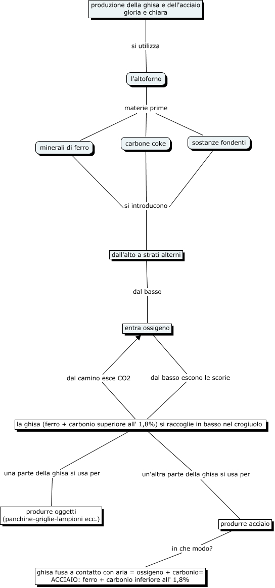 Questa Cmap, creata con IHMC CmapTools, contiene informazioni relative a: mappa ghisa chiara zanni!, la ghisa (ferro + carbonio superiore all' 1,8%) si raccoglie in basso nel crogiuolo un'altra parte della ghisa si usa per produrre acciaio, sostanze fondenti si introducono dall'alto a strati alterni, produrre acciaio in che modo? ghisa fusa a contatto con aria = ossigeno + carbonio= ACCIAIO: ferro + carbonio inferiore all' 1,8%, l'altoforno materie prime sostanze fondenti, carbone coke si introducono dall'alto a strati alterni, produzione della ghisa e dell'acciaio gloria e chiara si utilizza l'altoforno, l'altoforno materie prime carbone coke, la ghisa (ferro + carbonio superiore all' 1,8%) si raccoglie in basso nel crogiuolo una parte della ghisa si usa per produrre oggetti (panchine-griglie-lampioni ecc.), la ghisa (ferro + carbonio superiore all' 1,8%) si raccoglie in basso nel crogiuolo dal camino esce CO2 entra ossigeno, entra ossigeno dal basso escono le scorie la ghisa (ferro + carbonio superiore all' 1,8%) si raccoglie in basso nel crogiuolo, minerali di ferro si introducono dall'alto a strati alterni, dall'alto a strati alterni dal basso entra ossigeno, l'altoforno materie prime minerali di ferro