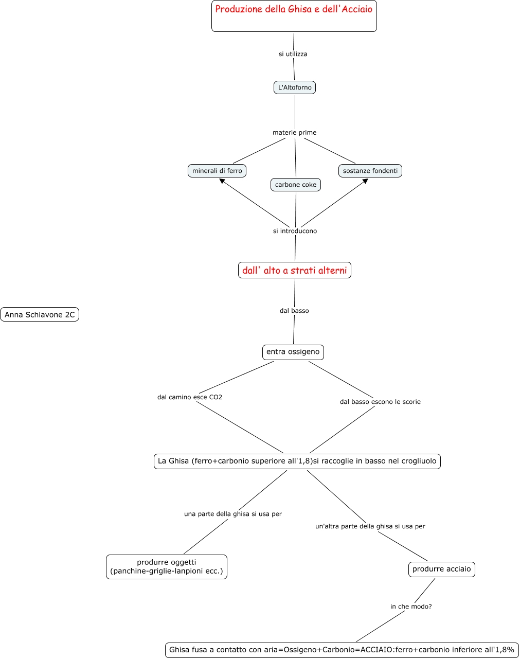 Questa Cmap, creata con IHMC CmapTools, contiene informazioni relative a: mappa ghisa Anna, Produzione della Ghisa e dell'Acciaio si utilizza L'Altoforno, L'Altoforno materie prime carbone coke, produrre acciaio in che modo? Ghisa fusa a contatto con aria=Ossigeno+Carbonio=ACCIAIO:ferro+carbonio inferiore all'1,8%, La Ghisa (ferro+carbonio superiore all'1,8)si raccoglie in basso nel crogliuolo un'altra parte della ghisa si usa per produrre acciaio, carbone coke si introducono sostanze fondenti, La Ghisa (ferro+carbonio superiore all'1,8)si raccoglie in basso nel crogliuolo una parte della ghisa si usa per produrre oggetti (panchine-griglie-lanpioni ecc.), dall' alto a strati alterni dal basso entra ossigeno, carbone coke si introducono minerali di ferro, carbone coke si introducono dall' alto a strati alterni, entra ossigeno dal camino esce CO2 La Ghisa (ferro+carbonio superiore all'1,8)si raccoglie in basso nel crogliuolo, entra ossigeno dal basso escono le scorie La Ghisa (ferro+carbonio superiore all'1,8)si raccoglie in basso nel crogliuolo, L'Altoforno materie prime minerali di ferro, L'Altoforno materie prime sostanze fondenti