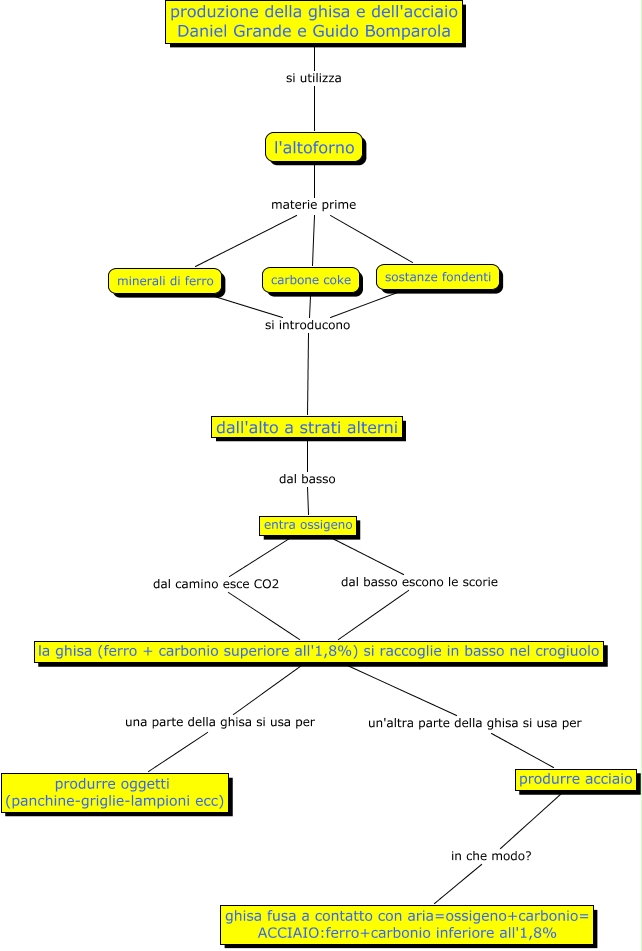 Questa Cmap, creata con IHMC CmapTools, contiene informazioni relative a: mappa ghisa Guido, produzione della ghisa e dell'acciaio Daniel Grande e Guido Bomparola si utilizza l'altoforno, carbone coke si introducono minerali di ferro, la ghisa (ferro + carbonio superiore all'1,8%) si raccoglie in basso nel crogiuolo una parte della ghisa si usa per produrre oggetti (panchine-griglie-lampioni ecc), produrre acciaio in che modo? ghisa fusa a contatto con aria=ossigeno+carbonio= ACCIAIO:ferro+carbonio inferiore all'1,8%, carbone coke si introducono dall'alto a strati alterni, l'altoforno materie prime sostanze fondenti, carbone coke si introducono sostanze fondenti, la ghisa (ferro + carbonio superiore all'1,8%) si raccoglie in basso nel crogiuolo un'altra parte della ghisa si usa per produrre acciaio, la ghisa (ferro + carbonio superiore all'1,8%) si raccoglie in basso nel crogiuolo dal basso escono le scorie entra ossigeno, entra ossigeno dal camino esce CO2 la ghisa (ferro + carbonio superiore all'1,8%) si raccoglie in basso nel crogiuolo, dall'alto a strati alterni dal basso entra ossigeno, l'altoforno materie prime carbone coke, l'altoforno materie prime minerali di ferro