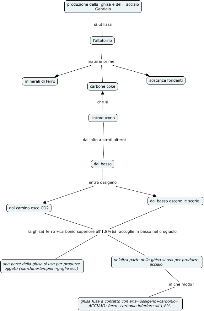 Questa Cmap, creata con IHMC CmapTools, contiene informazioni relative a: mappa ghisa gabriela, dal camino esce CO2 la ghisa( ferro +carbonio superiore all'1,8%)si raccoglie in basso nel crogiuolo una parte della ghisa si usa per produrre oggetti (panchine-lampioni-griglie ecc), l'altoforno materie prime carbone coke, introducono dall'alto a strati alterni dal basso, dal basso entra ossigeno dal basso escono le scorie, dal basso escono le scorie la ghisa( ferro +carbonio superiore all'1,8%)si raccoglie in basso nel crogiuolo un'altra parte della ghisa si usa per produrre acciaio, un'altra parte della ghisa si usa per produrre acciaio in che modo? ghisa fusa a contatto con aria=ossigeno+carbonio= ACCIAIO: ferro+carbonio inferiore all'1,8%, introducono che si carbone coke, dal basso escono le scorie la ghisa( ferro +carbonio superiore all'1,8%)si raccoglie in basso nel crogiuolo una parte della ghisa si usa per produrre oggetti (panchine-lampioni-griglie ecc), l'altoforno materie prime sostanze fondenti, dal basso entra ossigeno dal camino esce CO2, produzione della ghisa e dell' acciaio Gabriela si utilizza l'altoforno, dal camino esce CO2 la ghisa( ferro +carbonio superiore all'1,8%)si raccoglie in basso nel crogiuolo un'altra parte della ghisa si usa per produrre acciaio, l'altoforno materie prime minerali di ferro