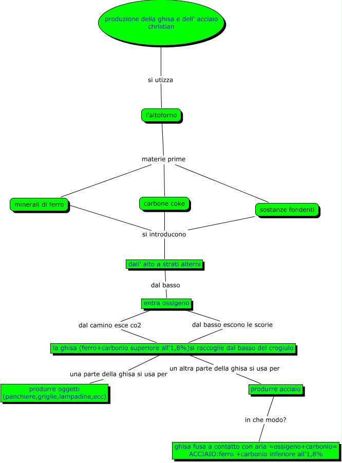 Questa Cmap, creata con IHMC CmapTools, contiene informazioni relative a: mappa ghisa christian, entra ossigeno dal camino esce co2 la ghisa (ferro+carbonio superiore all'1,8%)si raccoglie dal basso del crogiulo, carbone coke si introducono minerali di ferro, produrre acciaio in che modo? ghisa fusa a contatto con aria =ossigeno+carbonio= ACCIAIO:ferro +carbonio inferiore all'1,8%, la ghisa (ferro+carbonio superiore all'1,8%)si raccoglie dal basso del crogiulo dal basso escono le scorie entra ossigeno, produzione della ghisa e dell' acciaio christian si utizza l'altoforno, l'altoforno materie prime minerali di ferro, carbone coke si introducono dall' alto a strati alterni, dall' alto a strati alterni dal basso entra ossigeno, la ghisa (ferro+carbonio superiore all'1,8%)si raccoglie dal basso del crogiulo un altra parte della ghisa si usa per produrre acciaio, la ghisa (ferro+carbonio superiore all'1,8%)si raccoglie dal basso del crogiulo una parte della ghisa si usa per produrre oggetti (panchiere,griglie,lampadine,ecc), l'altoforno materie prime sostanze fondenti, l'altoforno materie prime carbone coke, carbone coke si introducono sostanze fondenti