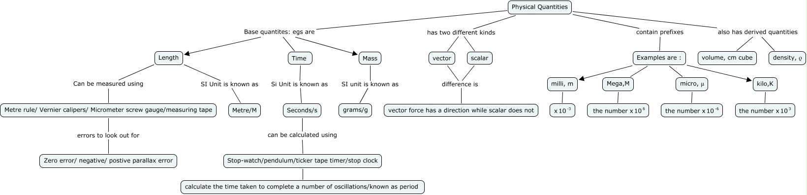 This Concept Map, created with IHMC CmapTools, has information related to: Ng Yi Song 3G 20 Physics, Physical Quantities Base quantites: egs are Time, Examples are : micro, μ, Physical Quantities has two different kinds scalar, Examples are : milli, m, Physical Quantities Base quantites: egs are Length, Metre rule/ Vernier calipers/ Micrometer screw gauge/measuring tape errors to look out for Zero error/ negative/ postive parallax error, Stop-watch/pendulum/ticker tape timer/stop clock calculate the time taken to complete a number of oscillations/known as period, Physical Quantities has two different kinds vector, kilo,K <math xmlns="http://www.w3.org/1998/Math/MathML"> <mrow> <mtext> the number x </mtext> <mmultiscripts> <mtext> 10 </mtext> <none/> <mtext> 3 </mtext> </mmultiscripts> </mrow> </math>, Seconds/s can be calculated using Stop-watch/pendulum/ticker tape timer/stop clock, Examples are : kilo,K, Physical Quantities contain prefixes Examples are :, micro, μ <math xmlns="http://www.w3.org/1998/Math/MathML"> <mrow> <mtext> the number x </mtext> <mmultiscripts> <mtext> 10 </mtext> <none/> <mtext> -6 </mtext> </mmultiscripts> </mrow> </math>, Examples are : Mega,M, Mass SI unit is known as grams/g, Length SI Unit is known as Metre/M, Length Can be measured using Metre rule/ Vernier calipers/ Micrometer screw gauge/measuring tape, Physical Quantities also has derived quantities volume, cm cube, vector difference is vector force has a direction while scalar does not, milli, m <math xmlns="http://www.w3.org/1998/Math/MathML"> <mrow> <mtext> x </mtext> <mmultiscripts> <mtext> 10 </mtext> <none/> <mtext> -3 </mtext> </mmultiscripts> </mrow> </math>