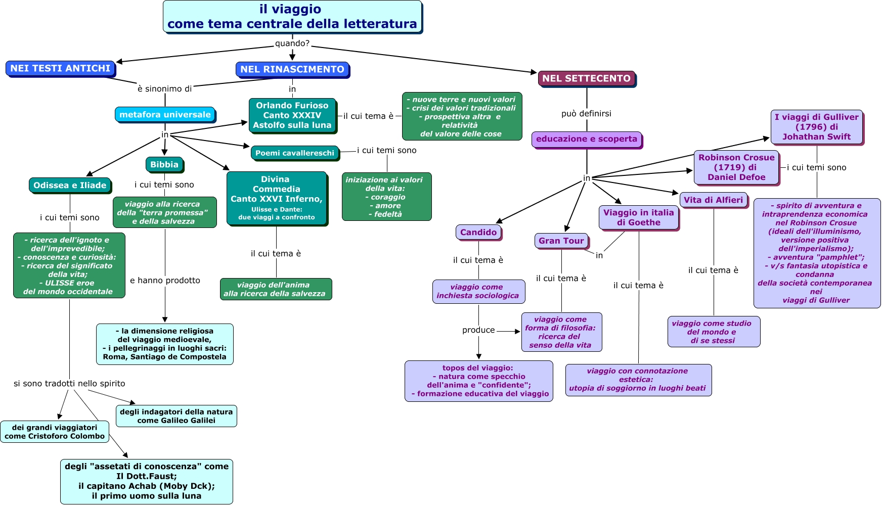 Questa Cmap, creata con IHMC CmapTools, contiene informazioni relative a: viaggio come tema centrale della letteratura, Candido il cui tema è viaggio come inchiesta sociologica, educazione e scoperta in I viaggi di Gulliver (1796) di Johathan Swift, Orlando Furioso Canto XXXIV Astolfo sulla luna il cui tema è - nuove terre e nuovi valori - crisi dei valori tradizionali - prospettiva altra e relatività del valore delle cose, educazione e scoperta in Viaggio in italia di Goethe, Viaggio in italia di Goethe il cui tema è viaggio con connotazione estetica: utopia di soggiorno in luoghi beati, Odissea e Iliade i cui temi sono - ricerca dell'ignoto e dell'imprevedibile; - conoscenza e curiosità: - ricerca del significato della vita; - ULISSE eroe del mondo occidentale, metafora universale in Odissea e Iliade, - ricerca dell'ignoto e dell'imprevedibile; - conoscenza e curiosità: - ricerca del significato della vita; - ULISSE eroe del mondo occidentale si sono tradotti nello spirito degli indagatori della natura come Galileo Galilei, metafora universale in Bibbia, Poemi cavallereschi i cui temi sono iniziazione ai valori della vita: - coraggio - amore - fedeltà, viaggio alla ricerca della "terra promessa" e della salvezza e hanno prodotto - la dimensione religiosa del viaggio medioevale, - i pellegrinaggi in luoghi sacri: Roma, Santiago de Compostela, educazione e scoperta in Gran Tour, metafora universale in Divina Commedia Canto XXVI Inferno, Ulisse e Dante: due viaggi a confronto, il viaggio come tema centrale della letteratura quando? NEI TESTI ANTICHI, educazione e scoperta in Vita di Alfieri, NEI TESTI ANTICHI è sinonimo di NEL RINASCIMENTO, il viaggio come tema centrale della letteratura quando? NEL RINASCIMENTO, il viaggio come tema centrale della letteratura quando? NEL SETTECENTO, educazione e scoperta in Candido, NEI TESTI ANTICHI è sinonimo di metafora universale