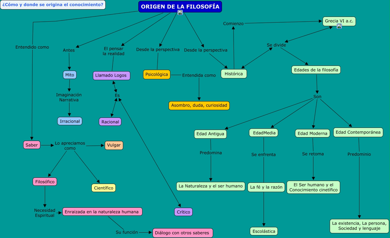 Este Cmap, tiene información relacionada con: ORIGEN DE LA FILOSOFÍA, Filosófico Necesidad Espiritual Enraizada en la naturaleza humana, Enraizada en la naturaleza humana Su función Diálogo con otros saberes, Llamado Logos Es Crítico, Edades de la filosofía Son Edad Moderna, Edades de la filosofía Son EdadMedia, Histórica Se divide Grecia VI a.c., Edad Antigua Predomina La Naturaleza y el ser humano, Llamado Logos Es Racional, Saber Lo apreciamos como Filosófico, ORIGEN DE LA FILOSOFÍA Desde la perspectiva Psicológica, Histórica Se divide Edades de la filosofía, Mito Imaginación Narrativa Irracional, ORIGEN DE LA FILOSOFÍA Antes Mito, ORIGEN DE LA FILOSOFÍA Desde la perspectiva Histórica, Histórica Comienzo Grecia VI a.c., Psicológica Entendida como Asombro, duda, curiosidad, Edades de la filosofía Son Edad Contemporánea, Edades de la filosofía Son Edad Antigua, ORIGEN DE LA FILOSOFÍA El pensar la realidad Llamado Logos, Saber Lo apreciamos como Vulgar