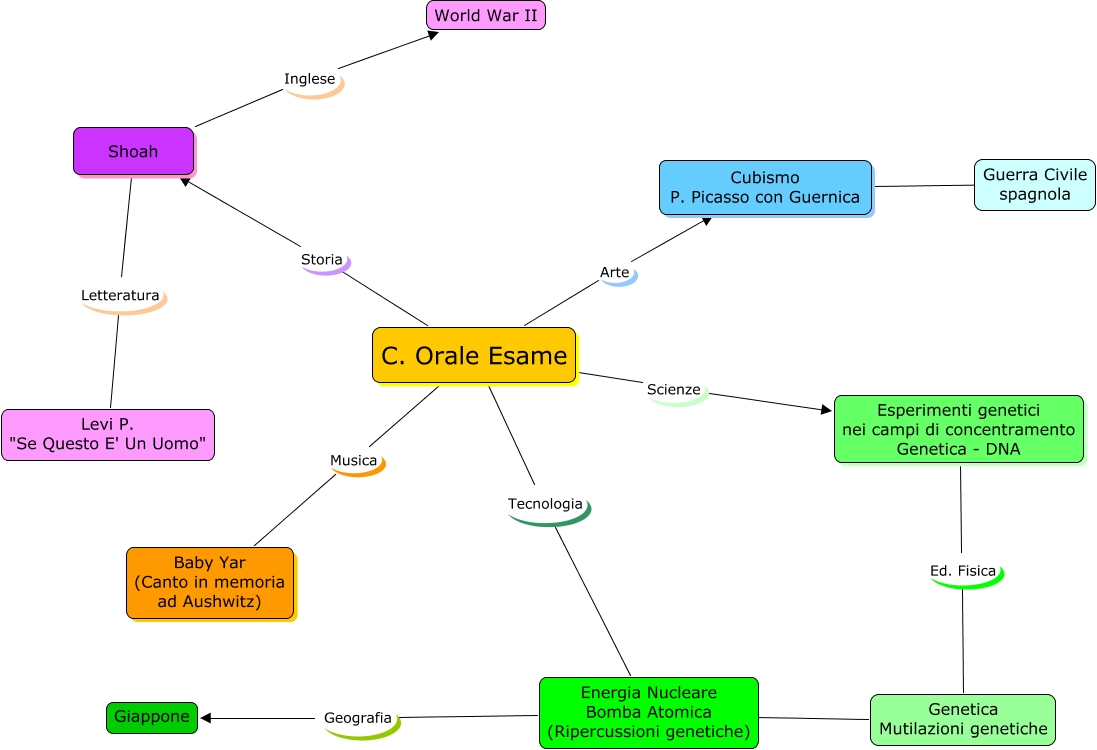Questa Cmap, creata con IHMC CmapTools, contiene informazioni relative a: Mappa Esame Verena Gollini, C. Orale Esame Tecnologia Energia Nucleare Bomba Atomica (Ripercussioni genetiche), C. Orale Esame Musica Baby Yar (Canto in memoria ad Aushwitz), C. Orale Esame Scienze Esperimenti genetici nei campi di concentramento Genetica - DNA, C. Orale Esame Storia Shoah, Shoah Letteratura Levi P. "Se Questo E' Un Uomo", Shoah Inglese World War II, Cubismo P. Picasso con Guernica ???? Guerra Civile spagnola, Esperimenti genetici nei campi di concentramento Genetica - DNA Ed. Fisica Genetica Mutilazioni genetiche, Genetica Mutilazioni genetiche ???? Energia Nucleare Bomba Atomica (Ripercussioni genetiche), Energia Nucleare Bomba Atomica (Ripercussioni genetiche) Geografia Giappone, C. Orale Esame Arte Cubismo P. Picasso con Guernica