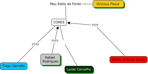Esse mapa conceitual, produzido no IHMC CmapTools, tem a informação relacionada a: Cores, Vinícius Paiva Meu Estilo de Fonte CORES, CORES Lucas Carvalho, CORES ???? Tiago Gamallo, Rafael Rodrigues ???? CORES, Marco Antonio Souza ???? CORES