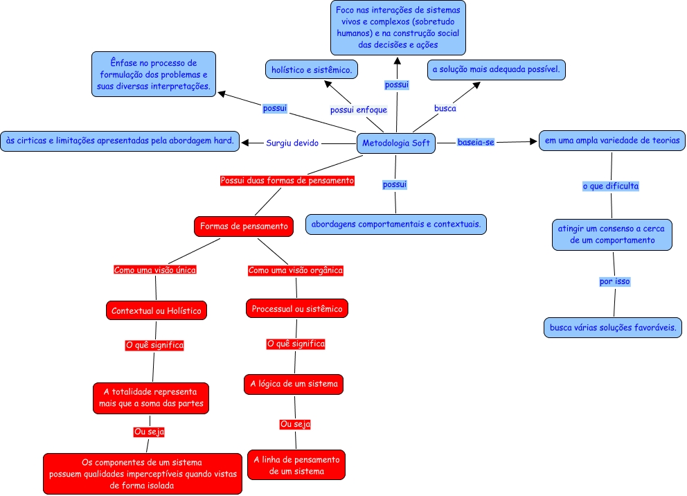 Esse mapa conceitual, produzido no IHMC CmapTools, tem a informação relacionada a: Soft, Contextual ou Holístico O quê significa A totalidade representa mais que a soma das partes, Processual ou sistêmico O quê significa A lógica de um sistema, Metodologia Soft Surgiu devido às cirticas e limitações apresentadas pela abordagem hard., Metodologia Soft baseia-se em uma ampla variedade de teorias, Metodologia Soft possui Ênfase no processo de formulação dos problemas e suas diversas interpretações., Metodologia Soft possui Foco nas interações de sistemas vivos e complexos (sobretudo humanos) e na construção social das decisões e ações, A lógica de um sistema Ou seja A linha de pensamento de um sistema, Metodologia Soft busca a solução mais adequada possível., atingir um consenso a cerca de um comportamento por isso busca várias soluções favoráveis., Formas de pensamento Como uma visão única Contextual ou Holístico, em uma ampla variedade de teorias o que dificulta atingir um consenso a cerca de um comportamento, Metodologia Soft possui abordagens comportamentais e contextuais., Formas de pensamento Como uma visão orgânica Processual ou sistêmico, Metodologia Soft possui enfoque holístico e sistêmico., Metodologia Soft Possui duas formas de pensamento Formas de pensamento, A totalidade representa mais que a soma das partes Ou seja Os componentes de um sistema possuem qualidades imperceptíveis quando vistas de forma isolada