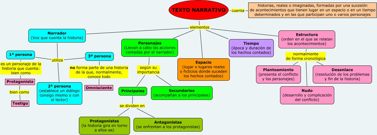 Este Cmap, tiene información relacionada con: Texto narrativo, TEXTO NARRATIVO elementos Espacio (lugar o lugares reales o ficticios donde suceden los hechos contados), Estructura (orden en el que se relatan los acontecimientos) normalmente de forma cronológica Nudo (desarrollo y complicación del conflicto), Estructura (orden en el que se relatan los acontecimientos) normalmente de forma cronológica Planteamiento (presenta el conflicto y los personajes), 1ª persona es un personaje de la historia que cuenta: bien como Protagonista, Narrador (Voz que cuenta la historia) utiliza 2ª persona (establece un diálogo consigo mismo o con el lector), TEXTO NARRATIVO elementos Tiempo (época y duración de los hechos contados), Narrador (Voz que cuenta la historia) utiliza 3ª persona, Principales se dividen en Antagonistas (se enfrentan a los protagonistas), Principales se dividen en Protagonistas (la historia gira en torno a ellos-as), TEXTO NARRATIVO cuenta historias, reales o imaginadas, formadas por una sucesión de acontecimientos que tienen lugar en un espacio o en un tiempo determinados y en las que participan uno o varios personajes, TEXTO NARRATIVO elementos Narrador (Voz que cuenta la historia), Estructura (orden en el que se relatan los acontecimientos) normalmente de forma cronológica Desenlace (resolución de los problemas y fin de la historia), 3ª persona no forma parte de una historia de la que, normalmente, conoce todo Omnisciente, Personajes (Llevan a cabo las acciones contadas por el narrador) según su importancia Principales, Protagonista bien como Testigo, TEXTO NARRATIVO elementos Personajes (Llevan a cabo las acciones contadas por el narrador), Narrador (Voz que cuenta la historia) utiliza 1ª persona, Personajes (Llevan a cabo las acciones contadas por el narrador) según su importancia Secundarios (acompañan a los principales), TEXTO NARRATIVO elementos Estructura (orden en el que se relatan los acontecimientos)