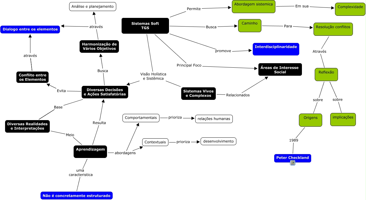 Esse mapa conceitual, produzido no IHMC CmapTools, tem a informação relacionada a: Sistemas Soft, Comportamentais prioriza relações humanas, Diversas Decisões e Ações Satisfatórias Base Diversas Realidades e Interpretações, Aprendizagem uma caracteristica Não é concretamente estruturado, Abordagem sistemica Em sua Complexidade, Reflexão sobre implicações, Aprendizagem abordagens Contextuais, Diversas Decisões e Ações Satisfatórias Busca Harmonização de Vários Objetivos, Sistemas Soft TGS Permite Abordagem sistemica, Diversas Decisões e Ações Satisfatórias Base Diversas Realidades e Interpretações, Conflito entre os Elementos através Dialogo entre os elementos, Aprendizagem abordagens Comportamentais, Sistemas Vivos e Complexos Relacionados Áreas de Interesse Social, Resolução conflitos Através Reflexão, Diversas Realidades e Interpretações Meio Aprendizagem, Conflito entre os Elementos através Dialogo entre os elementos, Aprendizagem Resulta Diversas Decisões e Ações Satisfatórias, Origens 1989 Peter Checkland, Sistemas Soft TGS Visão Holística e Sistêmica Diversas Decisões e Ações Satisfatórias, Caminho Para Resolução conflitos, Harmonização de Vários Objetivos através Dialogo entre os elementos