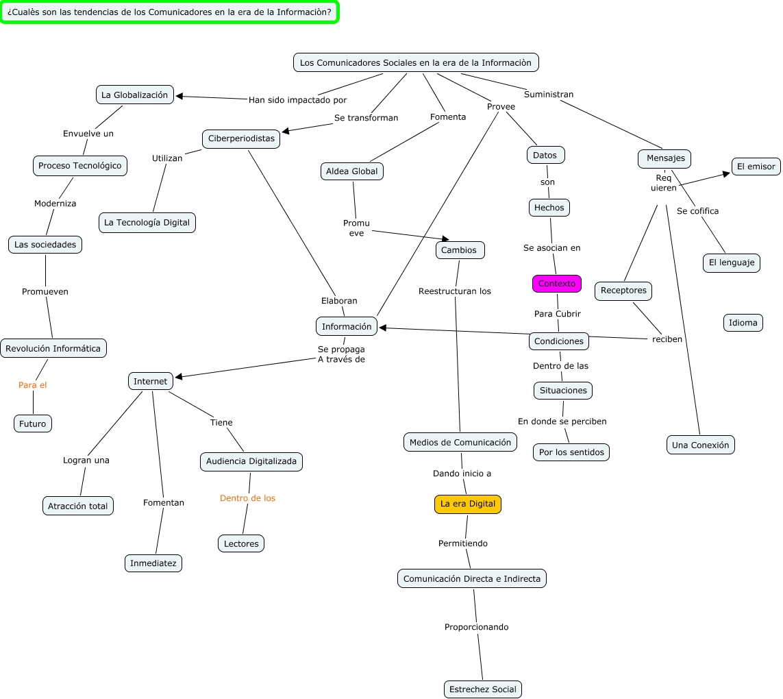 Este Cmap, tiene información relacionada con: Mapa conceptual Informatica 5, Aldea Global Promu eve Cambios, Internet Logran una Atracción total, Datos son Hechos, Los Comunicadores Sociales en la era de la Informaciòn Se transforman Ciberperiodistas, La era Digital Permitiendo Comunicación Directa e Indirecta, Hechos Se asocian en Contexto, Comunicación Directa e Indirecta Proporcionando Estrechez Social, Mensajes Req uieren Receptores, Internet Fomentan Inmediatez, La Globalización Envuelve un Proceso Tecnológico, Los Comunicadores Sociales en la era de la Informaciòn Han sido impactado por La Globalización, Información Se propaga A través de Internet, Los Comunicadores Sociales en la era de la Informaciòn Provee Datos, Los Comunicadores Sociales en la era de la Informaciòn Provee Información, Las sociedades Promueven Revolución Informática, Situaciones En donde se perciben Por los sentidos, Los Comunicadores Sociales en la era de la Informaciòn Fomenta Aldea Global, Condiciones Dentro de las Situaciones, Ciberperiodistas Utilizan La Tecnología Digital, Mensajes Req uieren El emisor