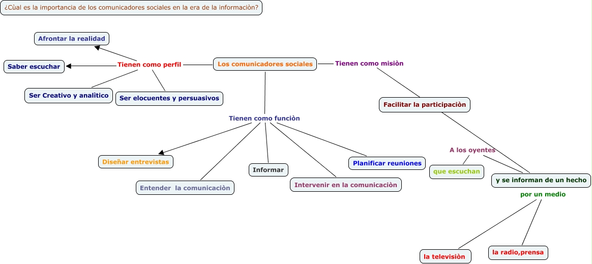 Este Cmap, tiene información relacionada con: Sin Título, Los comunicadores sociales Tienen como funciòn Diseñar entrevistas, Los comunicadores sociales Tienen como funciòn Intervenir en la comunicaciòn, Los comunicadores sociales Tienen como perfil Ser elocuentes y persuasivos, Los comunicadores sociales Tienen como funciòn Informar, Los comunicadores sociales Tienen como perfil Saber escuchar, Los comunicadores sociales Tienen como perfil Ser Creativo y analìtico, la televisiòn por un medio la radio,prensa, y se informan de un hecho A los oyentes que escuchan, Los comunicadores sociales Tienen como perfil Afrontar la realidad, Los comunicadores sociales Tienen como misiòn y se informan de un hecho, Los comunicadores sociales Tienen como funciòn Entender la comunicaciòn, Los comunicadores sociales Tienen como funciòn Planificar reuniones