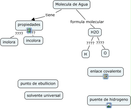Este Cmap, tiene información relacionada con: mapa conceptual molecula del agua, Molecula de Agua formula molecular H2O, H2O ???? O, H2O ???? H, propiedades ???? incolora, propiedades ???? inolora, Molecula de Agua tiene propiedades