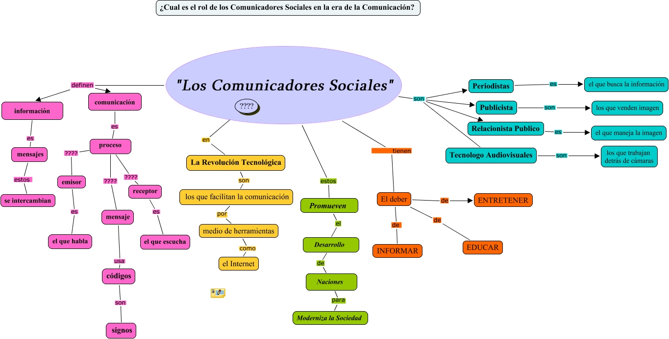 Este Cmap, tiene información relacionada con: Karen Rueda, La Revolución Tecnológica son los que facilitan la comunicación, mensaje usa códigos, Tecnologo Audiovisuales son los que trabajan detrás de cámaras, proceso ???? emisor, los que facilitan la comunicación por medio de herramientas, El deber de INFORMAR, mensajes estos se intercambian, medio de herramientas como el Internet, Publicista son los que venden imagen, "Los Comunicadores Sociales" son Periodistas, proceso ???? receptor, Relacionista Publico es el que maneja la imagen, receptor es el que escucha, emisor es el que habla, "Los Comunicadores Sociales" son Publicista, El deber de ENTRETENER, Promueven el Desarrollo, información es mensajes, comunicación es proceso, códigos son signos