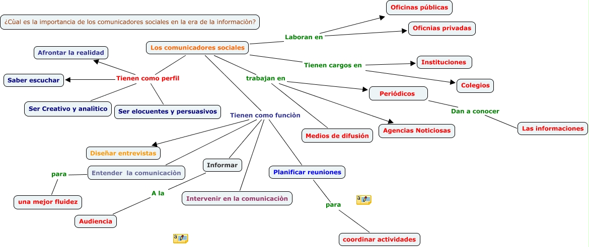Este Cmap, tiene información relacionada con: los comunicadores sociales terminado, Planificar reuniones para coordinar actividades, Los comunicadores sociales Tienen como perfil Ser elocuentes y persuasivos, Los comunicadores sociales trabajan en Periódicos, Los comunicadores sociales trabajan en Agencias Noticiosas, Los comunicadores sociales Tienen como funciòn Diseñar entrevistas, Los comunicadores sociales Tienen como funciòn Entender la comunicaciòn, Los comunicadores sociales Laboran en Oficnias privadas, Los comunicadores sociales trabajan en Medios de difusión, Los comunicadores sociales Tienen como perfil Ser Creativo y analìtico, Los comunicadores sociales Tienen como funciòn Intervenir en la comunicaciòn, Los comunicadores sociales Tienen como funciòn Informar, Periódicos Dan a conocer Las informaciones, Los comunicadores sociales Tienen como perfil Afrontar la realidad, Los comunicadores sociales Tienen cargos en Instituciones, Informar A la Audiencia, Los comunicadores sociales Laboran en Oficinas públicas, Los comunicadores sociales Tienen como perfil Saber escuchar, Los comunicadores sociales Tienen como funciòn Planificar reuniones, Entender la comunicaciòn para una mejor fluidez, Los comunicadores sociales Tienen cargos en Colegios