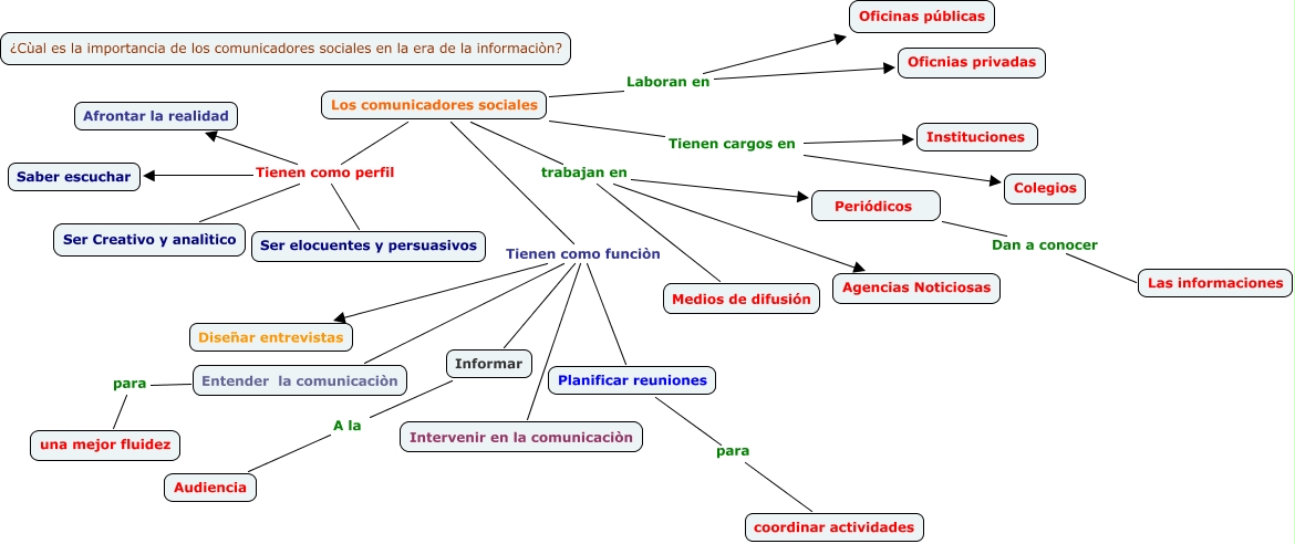 Este Cmap, tiene información relacionada con: comunicadores final, Los comunicadores sociales Laboran en Oficinas públicas, Los comunicadores sociales Tienen como perfil Saber escuchar, Los comunicadores sociales Tienen como funciòn Entender la comunicaciòn, Los comunicadores sociales Laboran en Oficnias privadas, Los comunicadores sociales trabajan en Agencias Noticiosas, Los comunicadores sociales Tienen como funciòn Diseñar entrevistas, Los comunicadores sociales Tienen como perfil Ser Creativo y analìtico, Planificar reuniones para coordinar actividades, Los comunicadores sociales Tienen como perfil Afrontar la realidad, Los comunicadores sociales Tienen como funciòn Informar, Los comunicadores sociales Tienen como perfil Ser elocuentes y persuasivos, Los comunicadores sociales Tienen cargos en Instituciones, Los comunicadores sociales Tienen como funciòn Planificar reuniones, Periódicos Dan a conocer Las informaciones, Entender la comunicaciòn para una mejor fluidez, Los comunicadores sociales Tienen como funciòn Intervenir en la comunicaciòn, Los comunicadores sociales trabajan en Periódicos, Informar A la Audiencia, Los comunicadores sociales trabajan en Medios de difusión, Los comunicadores sociales Tienen cargos en Colegios
