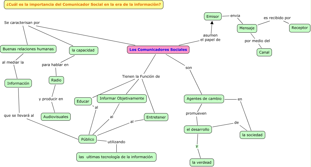 Este Cmap, tiene información relacionada con: Examen de Critel y abdiel.cmap listoo, Mensaje por medio del Canal, Radio y producir en Audiovisuales, la capacidad para hablar en Radio, Mensaje es recibido por Receptor, Los Comunicadores Sociales Se caracterisan por Buenas relaciones humanas, Los Comunicadores Sociales Se caracterisan por la capacidad, Los Comunicadores Sociales Tienen la Función de Entretener, Emisor envia Mensaje, Agentes de cambio promueven el desarrollo, Educar al Público, Información que se llevará al Público, Buenas relaciones humanas al mediar la Información, Los Comunicadores Sociales Tienen la Función de Educar, el desarrollo y la verdead, Los Comunicadores Sociales asumen el papel de Emisor, Entretener al Público, Público utilizando las ultimas tecnología de la información, Los Comunicadores Sociales son Agentes de cambio, Los Comunicadores Sociales Tienen la Función de Informar Objetivamente, Informar Objetivamente al Público