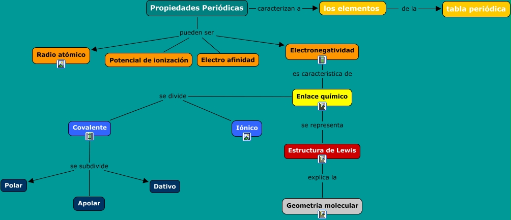 Este Cmap, tiene información relacionada con: Propiedades periódicas, Estructura de Lewis explica la Geometría molecular, los elementos de la tabla periódica, Covalente se subdivide Apolar, Enlace químico se representa Estructura de Lewis, Propiedades Periódicas caracterizan a los elementos, Enlace químico se divide Covalente, Propiedades Periódicas pueden ser Electro afinidad, Electronegatividad es caracteristica de Enlace químico, Covalente se subdivide Dativo, Enlace químico se divide Iónico, Propiedades Periódicas pueden ser Potencial de ionización, Propiedades Periódicas pueden ser Radio atómico, Propiedades Periódicas pueden ser Electronegatividad, Covalente se subdivide Polar