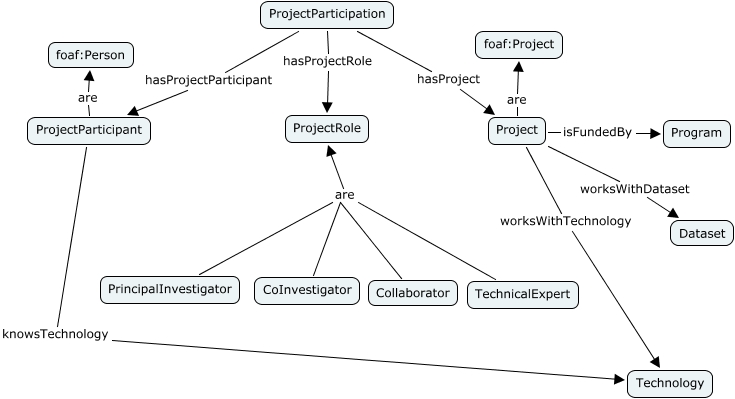 This Concept Map, created with IHMC CmapTools, has information related to: ESIP_Projects_v1, Project worksWithDataset Dataset, CoInvestigator are ProjectRole, ProjectParticipation hasProjectRole ProjectRole, ProjectParticipation hasProject Project, ProjectParticipant are foaf:Person, ProjectParticipation hasProjectParticipant ProjectParticipant, ProjectParticipant knowsTechnology Technology, Project are foaf:Project, Project worksWithTechnology Technology, Project isFundedBy Program, Collaborator are ProjectRole, PrincipalInvestigator are ProjectRole, TechnicalExpert are ProjectRole