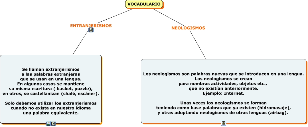 Este Cmap, tiene información relacionada con: EXTRANJERISMO NEOLOGISMO, VOCABULARIO NEOLOGISMOS Los neologismos son palabras nuevas que se introducen en una lengua. Los neologismos se crean para nombras actividades, objetos etc., que no existían anteriormente. Ejemplo: Internet. Unas veces los neologismos se forman teniendo como base palabras que ya existen (hidromasaje), y otras adoptando neologismos de otras lenguas (airbag)., VOCABULARIO ENTRANJERISMOS Se llaman extranjerismos a las palabras extranjeras que se usan en una lengua. En algunos casos se mantiene su misma escritura ( basket, puzzle), en otros, se castellanizan (chalé, escáner). Solo debemos utilizar los extranjerismos cuando no exista en nuestro idioma una palabra equivalente.