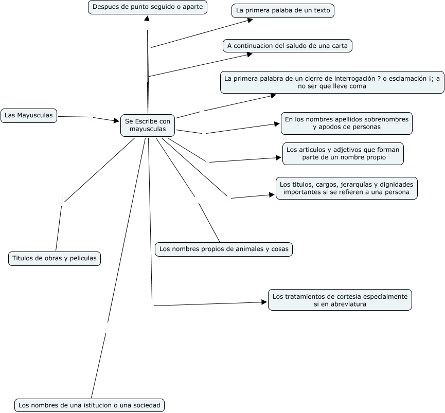 Este Cmap, tiene información relacionada con: Las mayúsculas(David romero), Se Escribe con mayusculas La primera palaba de un texto, Se Escribe con mayusculas La primera palabra de un cierre de interrogación ? o esclamación ¡; a no ser que lleve coma, Se Escribe con mayusculas Despues de punto seguido o aparte, Se Escribe con mayusculas Titulos de obras y peliculas, Se Escribe con mayusculas Los tratamientos de cortesía especialmente si en abreviatura, Se Escribe con mayusculas A continuacion del saludo de una carta, Se Escribe con mayusculas En los nombres apellidos sobrenombres y apodos de personas, Se Escribe con mayusculas Los nombres de una istitucion o una sociedad, Las Mayusculas Se Escribe con mayusculas, Se Escribe con mayusculas Los articulos y adjetivos que forman parte de un nombre propio, Se Escribe con mayusculas Los nombres propios de animales y cosas, Se Escribe con mayusculas Los titulos, cargos, jerarquías y dignidades importantes si se refieren a una persona