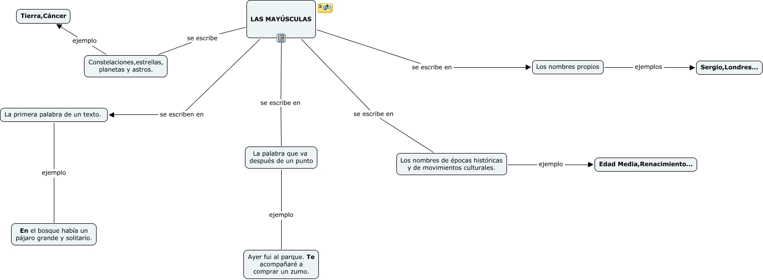 Este Cmap, tiene información relacionada con: Las mayúsculas-Larisa, LAS MAYÚSCULAS se escribe en Los nombres propios, Los nombres de épocas históricas y de movimientos culturales. ejemplo Edad Media,Renacimiento..., Constelaciones,estrellas, planetas y astros. ejemplo Tierra,Cáncer, La primera palabra de un texto. ejemplo En el bosque había un pájaro grande y solitario., LAS MAYÚSCULAS se escribe en Los nombres de épocas históricas y de movimientos culturales., LAS MAYÚSCULAS se escribe Constelaciones,estrellas, planetas y astros., LAS MAYÚSCULAS se escribe en La palabra que va después de un punto, LAS MAYÚSCULAS se escriben en La primera palabra de un texto., Los nombres propios ejemplos Sergio,Londres..., La palabra que va después de un punto ejemplo Ayer fui al parque. Te acompañaré a comprar un zumo.