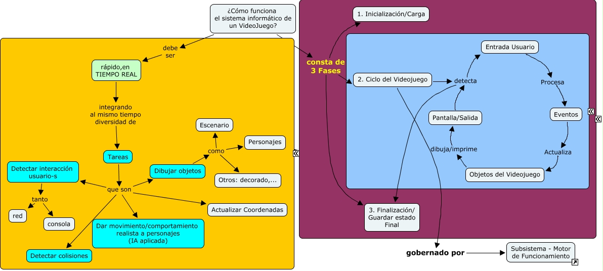 Este Cmap, tiene información relacionada con: comofuncionavideojuego_v2, Tareas que son Detectar interacción usuario-s, 2. Ciclo del Videojuego detecta Entrada Usuario, Dibujar objetos como Escenario, Requisitos/ Necesidades de Funcionamiento de un VideoJuego se llevan a cabo siguiendo una Estructura Programa de un VideoJuego, ¿Cómo funciona el sistema informático de un VideoJuego? consta de 3 Fases 2. Ciclo del Videojuego, Pantalla/Salida detecta Entrada Usuario, ¿Cómo funciona el sistema informático de un VideoJuego? debe ser rápido,en TIEMPO REAL, 2. Ciclo del Videojuego detecta 3. Finalización/ Guardar estado Final, Detectar interacción usuario-s tanto red, Entrada Usuario Procesa Eventos, ¿Cómo funciona el sistema informático de un VideoJuego? consta de 3 Fases 3. Finalización/ Guardar estado Final, Tareas que son Dibujar objetos, Pantalla/Salida detecta 3. Finalización/ Guardar estado Final, 2. Ciclo del Videojuego gobernado por Subsistema - Motor de Funcionamiento, Tareas que son Dar movimiento/comportamiento realista a personajes (IA aplicada), Objetos del Videojuego dibuja/imprime Pantalla/Salida, Detectar interacción usuario-s tanto consola, Tareas que son Detectar colisiones, rápido,en TIEMPO REAL integrando al mismo tiempo diversidad de Tareas, ¿Cómo funciona el sistema informático de un VideoJuego? consta de 3 Fases 1. Inicialización/Carga