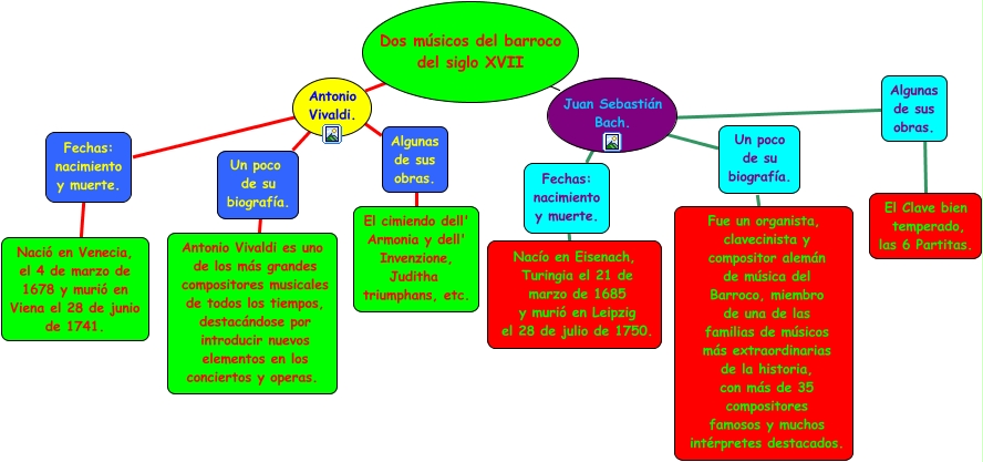 Este Cmap, tiene información relacionada con: Autores de la música del barroco, Juan Sebastián Bach. ???? Fechas: nacimiento y muerte., Dos músicos del barroco del siglo XVII ???? Juan Sebastián Bach., Algunas de sus obras. ???? El Clave bien temperado, las 6 Partitas., Juan Sebastián Bach. ???? Un poco de su biografía., Juan Sebastián Bach. ???? Algunas de sus obras., Un poco de su biografía. ???? Antonio Vivaldi es uno de los más grandes compositores musicales de todos los tiempos, destacándose por introducir nuevos elementos en los conciertos y operas., Fechas: nacimiento y muerte. ???? Nacío en Eisenach, Turingia el 21 de marzo de 1685 y murió en Leipzig el 28 de julio de 1750., Un poco de su biografía. ???? Fue un organista, clavecinista y compositor alemán de música del Barroco, miembro de una de las familias de músicos más extraordinarias de la historia, con más de 35 compositores famosos y muchos intérpretes destacados., Dos músicos del barroco del siglo XVII ???? Antonio Vivaldi., Fechas: nacimiento y muerte. ???? Nació en Venecia, el 4 de marzo de 1678 y murió en Viena el 28 de junio de 1741., Algunas de sus obras. ???? El cimiendo dell' Armonia y dell' Invenzione, Juditha triumphans, etc., Antonio Vivaldi. ???? Algunas de sus obras., Antonio Vivaldi. ???? Un poco de su biografía., Antonio Vivaldi. ???? Fechas: nacimiento y muerte.