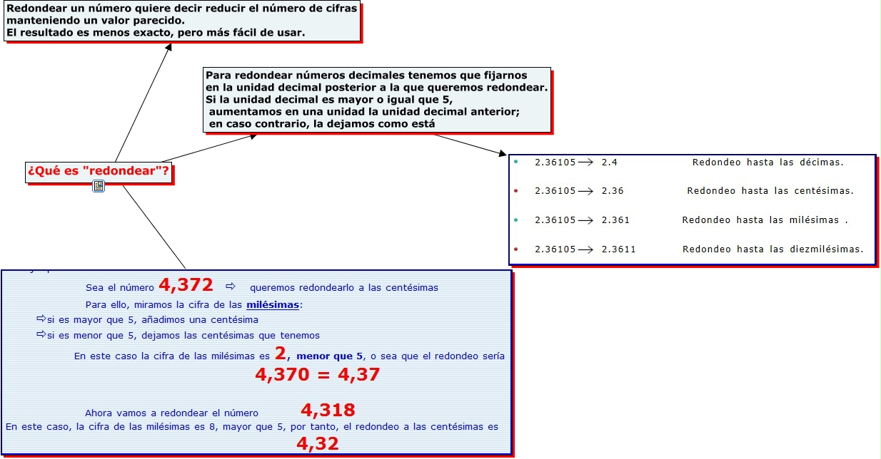 Este Cmap, tiene información relacionada con: REDONDEAR NÚMEROS DECIMALES, ¿Qué es "redondear"? ???? Para redondear números decimales tenemos que fijarnos en la unidad decimal posterior a la que queremos redondear. Si la unidad decimal es mayor o igual que 5, aumentamos en una unidad la unidad decimal anterior; en caso contrario, la dejamos como está, ¿Qué es "redondear"? ????, Para redondear números decimales tenemos que fijarnos en la unidad decimal posterior a la que queremos redondear. Si la unidad decimal es mayor o igual que 5, aumentamos en una unidad la unidad decimal anterior; en caso contrario, la dejamos como está ????, ¿Qué es "redondear"? ???? Redondear un número quiere decir reducir el número de cifras manteniendo un valor parecido. El resultado es menos exacto, pero más fácil de usar.