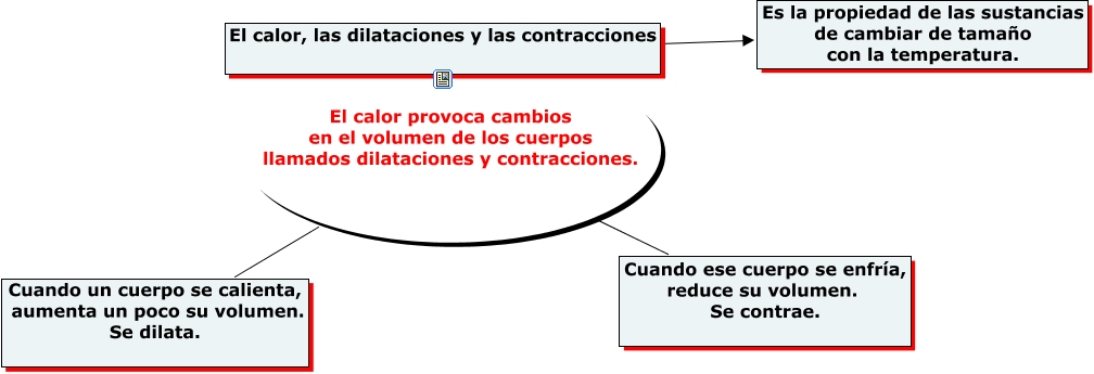 Este Cmap, tiene información relacionada con: EL CALOR LAS DILATACIONES Y CONTRACCIONES, El calor, las dilataciones y las contracciones El calor provoca cambios en el volumen de los cuerpos llamados dilataciones y contracciones. Cuando ese cuerpo se enfría, reduce su volumen. Se contrae., El calor, las dilataciones y las contracciones ???? Es la propiedad de las sustancias de cambiar de tamaño con la temperatura., El calor, las dilataciones y las contracciones El calor provoca cambios en el volumen de los cuerpos llamados dilataciones y contracciones. Cuando un cuerpo se calienta, aumenta un poco su volumen. Se dilata.