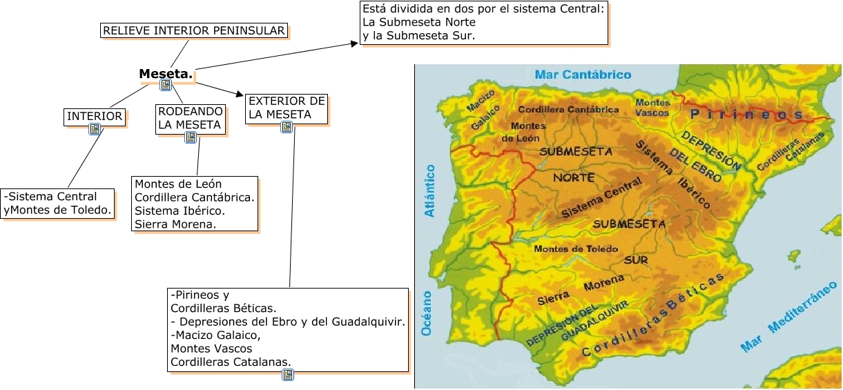 Este Cmap, tiene información relacionada con: RELIEVE INTERIOR, RELIEVE INTERIOR PENINSULAR Meseta. Está dividida en dos por el sistema Central: La Submeseta Norte y la Submeseta Sur., RELIEVE INTERIOR PENINSULAR Meseta. EXTERIOR DE LA MESETA, EXTERIOR DE LA MESETA ???? -Pirineos y Cordilleras Béticas. - Depresiones del Ebro y del Guadalquivir. -Macizo Galaico, Montes Vascos Cordilleras Catalanas., RELIEVE INTERIOR PENINSULAR Meseta. RODEANDO LA MESETA, RELIEVE INTERIOR PENINSULAR Meseta. INTERIOR, RODEANDO LA MESETA ???? Montes de León Cordillera Cantábrica. Sistema Ibérico. Sierra Morena., INTERIOR ???? -Sistema Central yMontes de Toledo.