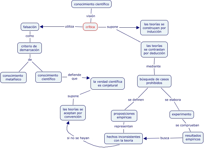 Este Cmap, tiene información relacionada con: conocimiento científico crítico, crítica utiliza falsación, criterio de demarcación de conocimiento científico, conocimiento científico defiende que la verdad científica es conjetural, las teorías se contrastan por deducción mediante búsqueda de casos prohibidos, criterio de demarcación de conocimiento metafísico, búsqueda de casos prohibidos se elabora experimento, resultados empíricos busca hechos inconsistentes con la teoría, conocimiento científico visión crítica, hechos inconsistentes con la teoría si no se hayan las teorías se aceptan por convención, la verdad científica es conjetural supone las teorías se aceptan por convención, crítica supone las teorías se construyen por inducción, búsqueda de casos prohibidos se definen proposiciones empíricas, proposiciones empíricas representan hechos inconsistentes con la teoría, crítica supone las teorías se contrastan por deducción, falsación como criterio de demarcación, experimento se comprueban resultados empíricos