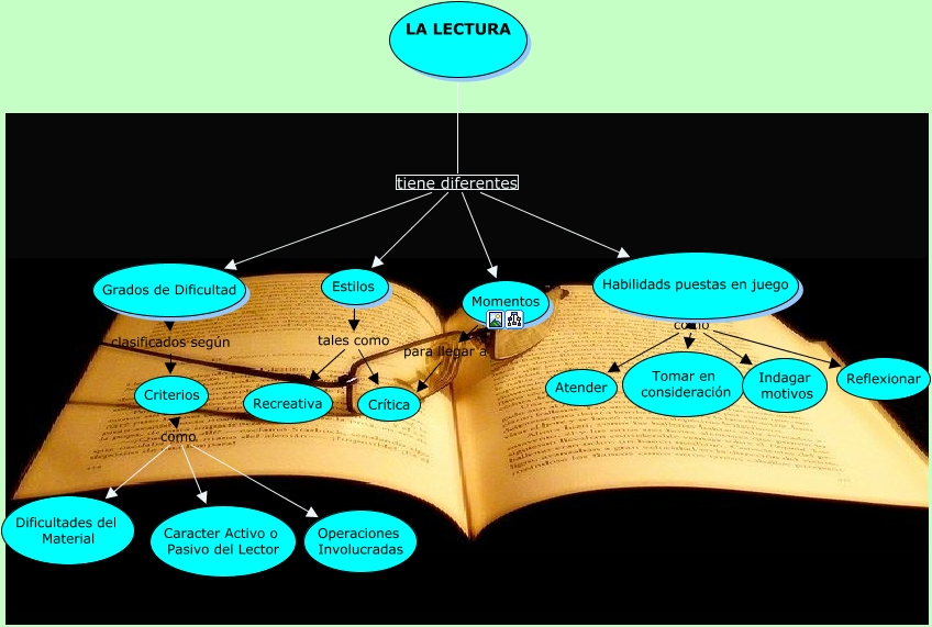 Este mapa conceptual tiene información relacionada a: la LECTURA, LA LECTURA tiene diferentes Estilos, Habilidads puestas en juego como Atender, Estilos tales como Recreativa, Criterios como Dificultades del Material, Momentos para llegar a Crítica, Grados de Dificultad clasificados según Criterios, Habilidads puestas en juego como Tomar en consideración, LA LECTURA tiene diferentes Habilidads puestas en juego, LA LECTURA tiene diferentes Momentos, Habilidads puestas en juego como Reflexionar