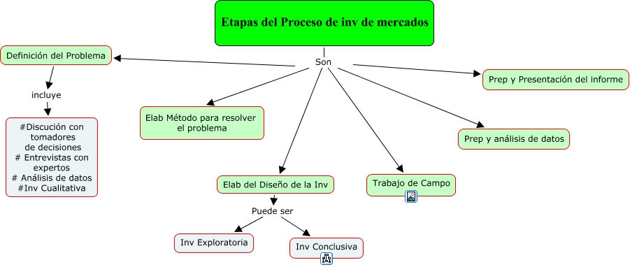 Este mapa conceptual tiene información relacionada a: Inv de Mercados.cmap, Etapas del Proceso de inv de mercados Son Trabajo de Campo, Elab del Diseño de la Inv Puede ser Inv Exploratoria, Etapas del Proceso de inv de mercados Son Prep y Presentación del informe, Definición del Problema incluye #Discución con tomadores de decisiones # Entrevistas con expertos # Análisis de datos #Inv Cualitativa, Etapas del Proceso de inv de mercados Son Elab Método para resolver el problema, Etapas del Proceso de inv de mercados Son Elab del Diseño de la Inv, Etapas del Proceso de inv de mercados Son Prep y análisis de datos, Elab del Diseño de la Inv Puede ser Inv Conclusiva, Etapas del Proceso de inv de mercados Son Definición del Problema