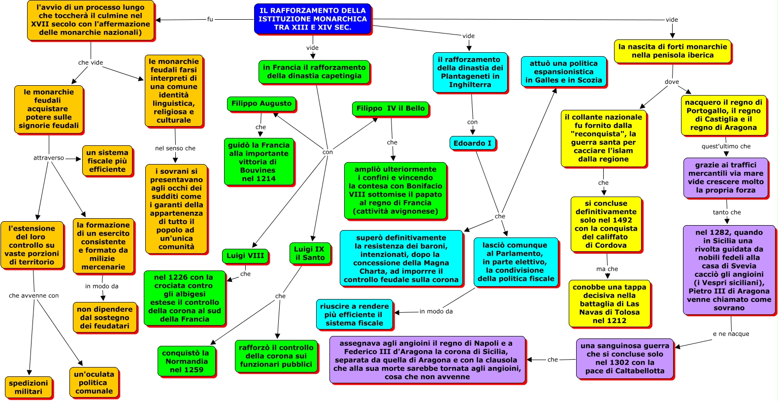Questa Cmap, creata con IHMC CmapTools, contiene informazioni relative a: Le monarchie nel XIII secolo, il collante nazionale fu fornito dalla "reconquista", la guerra santa per cacciare l'islam dalla regione che si concluse definitivamente solo nel 1492 con la conquista del califfato di Cordova, Filippo IV il Bello che ampliò ulteriormente i confini e vincendo la contesa con Bonifacio VIII sottomise il papato al regno di Francia (cattività avignonese), l'estensione del loro controllo su vaste porzioni di territorio che avvenne con spedizioni militari, Edoardo I che attuò una politica espansionistica in Galles e in Scozia, nacquero il regno di Portogallo, il regno di Castiglia e il regno di Aragona quest'ultimo che grazie ai traffici mercantili via mare vide crescere molto la propria forza, in Francia il rafforzamento della dinastia capetingia con Luigi IX il Santo, Edoardo I che superò definitivamente la resistenza dei baroni, intenzionati, dopo la concessione della Magna Charta, ad imporrre il controllo feudale sulla corona, la nascita di forti monarchie nella penisola iberica dove il collante nazionale fu fornito dalla "reconquista", la guerra santa per cacciare l'islam dalla regione, Edoardo I che lasciò comunque al Parlamento, in parte elettivo, la condivisione della politica fiscale, le monarchie feudali farsi interpreti di una comune identità linguistica, religiosa e culturale nel senso che i sovrani si presentavano agli occhi dei sudditi come i garanti della appartenenza di tutto il popolo ad un'unica comunità, le monarchie feudali acquistare potere sulle signorie feudali attraverso la formazione di un esercito consistente e formato da milizie mercenarie, Filippo Augusto che guidò la Francia alla importante vittoria di Bouvines nel 1214, la nascita di forti monarchie nella penisola iberica dove nacquero il regno di Portogallo, il regno di Castiglia e il regno di Aragona, una sanguinosa guerra che si concluse solo nel 1302 con la pace di Caltabellotta che assegnava agli angioini il regno di Napoli e a Federico III d'Aragona la corona di Sicilia, separata da quella di Aragona e con la clausola che alla sua morte sarebbe tornata agli angioini, cosa che non avvenne, l'avvio di un processo lungo che toccherà il culmine nel XVII secolo con l'affermazione delle monarchie nazionali) che vide le monarchie feudali acquistare potere sulle signorie feudali, Luigi VIII che nel 1226 con la crociata contro gli albigesi estese il controllo della corona al sud della Francia, in Francia il rafforzamento della dinastia capetingia con Filippo IV il Bello, in Francia il rafforzamento della dinastia capetingia con Luigi VIII, IL RAFFORZAMENTO DELLA ISTITUZIONE MONARCHICA TRA XIII E XIV SEC. vide il rafforzamento della dinastia dei Plantageneti in Inghilterra, l'avvio di un processo lungo che toccherà il culmine nel XVII secolo con l'affermazione delle monarchie nazionali) che vide le monarchie feudali farsi interpreti di una comune identità linguistica, religiosa e culturale