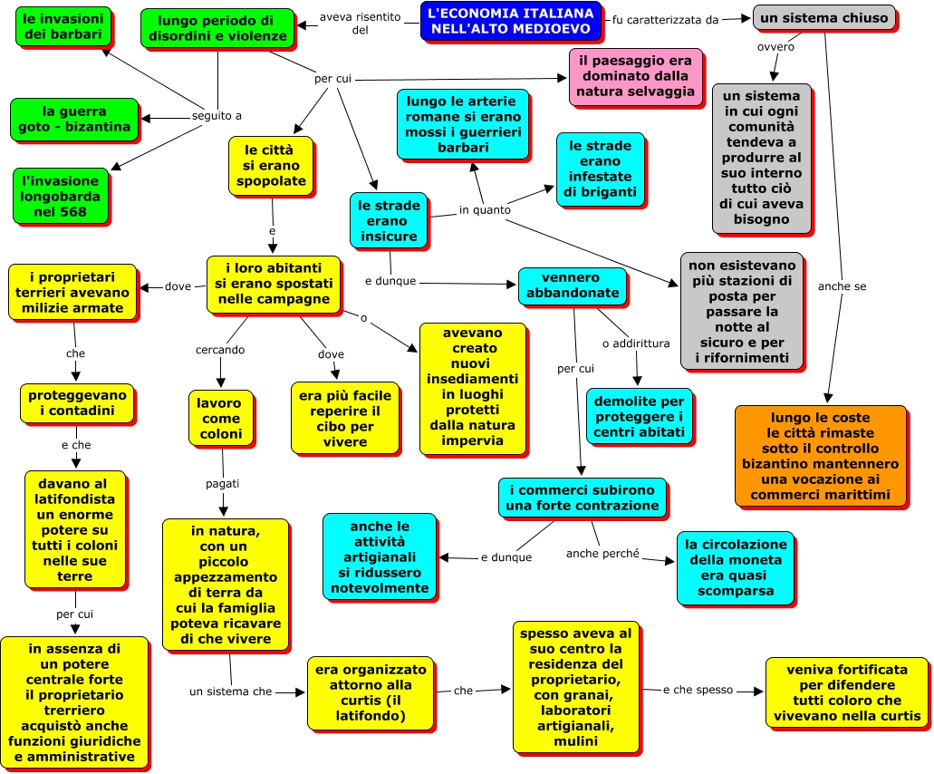 Questa Cmap, creata con IHMC CmapTools, contiene informazioni relative a: L'economia nell'alto Medioevo 1, lungo periodo di disordini e violenze seguito a le invasioni dei barbari, i loro abitanti si erano spostati nelle campagne cercando lavoro come coloni, lungo periodo di disordini e violenze seguito a l'invasione longobarda nel 568, un sistema chiuso anche se lungo le coste le città rimaste sotto il controllo bizantino mantennero una vocazione ai commerci marittimi, le strade erano insicure in quanto lungo le arterie romane si erano mossi i guerrieri barbari, lungo periodo di disordini e violenze per cui le città si erano spopolate, i loro abitanti si erano spostati nelle campagne dove era più facile reperire il cibo per vivere, un sistema chiuso ovvero un sistema in cui ogni comunità tendeva a produrre al suo interno tutto ciò di cui aveva bisogno, i loro abitanti si erano spostati nelle campagne o avevano creato nuovi insediamenti in luoghi protetti dalla natura impervia, spesso aveva al suo centro la residenza del proprietario, con granai, laboratori artigianali, mulini e che spesso veniva fortificata per difendere tutti coloro che vivevano nella curtis, lavoro come coloni pagati in natura, con un piccolo appezzamento di terra da cui la famiglia poteva ricavare di che vivere, vennero abbandonate o addirittura demolite per proteggere i centri abitati, le strade erano insicure e dunque vennero abbandonate, L'ECONOMIA ITALIANA NELL'ALTO MEDIOEVO fu caratterizzata da un sistema chiuso, era organizzato attorno alla curtis (il latifondo) che spesso aveva al suo centro la residenza del proprietario, con granai, laboratori artigianali, mulini, i commerci subirono una forte contrazione anche perché la circolazione della moneta era quasi scomparsa, davano al latifondista un enorme potere su tutti i coloni nelle sue terre per cui in assenza di un potere centrale forte il proprietario trerriero acquistò anche funzioni giuridiche e amministrative, vennero abbandonate per cui i commerci subirono una forte contrazione, le città si erano spopolate e i loro abitanti si erano spostati nelle campagne, lungo periodo di disordini e violenze per cui il paesaggio era dominato dalla natura selvaggia