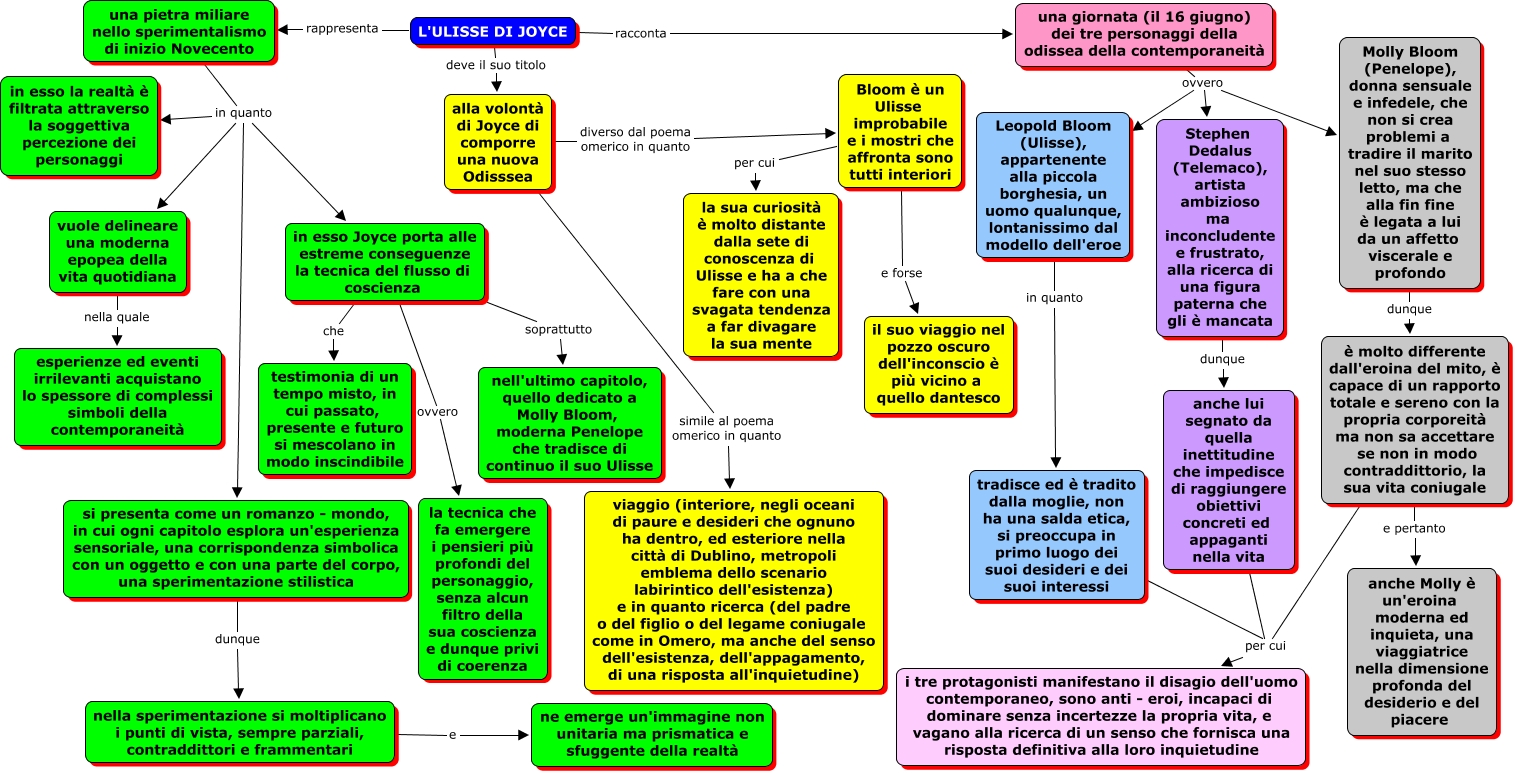 Questa Cmap, creata con IHMC CmapTools, contiene informazioni relative a: L'Ulisse di Joyce, Bloom è un Ulisse improbabile e i mostri che affronta sono tutti interiori per cui la sua curiosità è molto distante dalla sete di conoscenza di Ulisse e ha a che fare con una svagata tendenza a far divagare la sua mente, L'ULISSE DI JOYCE deve il suo titolo alla volontà di Joyce di comporre una nuova Odisssea, Bloom è un Ulisse improbabile e i mostri che affronta sono tutti interiori e forse il suo viaggio nel pozzo oscuro dell'inconscio è più vicino a quello dantesco, una giornata (il 16 giugno) dei tre personaggi della odissea della contemporaneità ovvero Leopold Bloom (Ulisse), appartenente alla piccola borghesia, un uomo qualunque, lontanissimo dal modello dell'eroe, alla volontà di Joyce di comporre una nuova Odisssea simile al poema omerico in quanto viaggio (interiore, negli oceani di paure e desideri che ognuno ha dentro, ed esteriore nella città di Dublino, metropoli emblema dello scenario labirintico dell'esistenza) e in quanto ricerca (del padre o del figlio o del legame coniugale come in Omero, ma anche del senso dell'esistenza, dell'appagamento, di una risposta all'inquietudine), L'ULISSE DI JOYCE racconta una giornata (il 16 giugno) dei tre personaggi della odissea della contemporaneità, tradisce ed è tradito dalla moglie, non ha una salda etica, si preoccupa in primo luogo dei suoi desideri e dei suoi interessi per cui i tre protagonisti manifestano il disagio dell'uomo contemporaneo, sono anti - eroi, incapaci di dominare senza incertezze la propria vita, e vagano alla ricerca di un senso che fornisca una risposta definitiva alla loro inquietudine, Molly Bloom (Penelope), donna sensuale e infedele, che non si crea problemi a tradire il marito nel suo stesso letto, ma che alla fin fine è legata a lui da un affetto viscerale e profondo dunque è molto differente dall'eroina del mito, è capace di un rapporto totale e sereno con la propria corporeità ma non sa accettare se non in modo contraddittorio, la sua vita coniugale, L'ULISSE DI JOYCE rappresenta una pietra miliare nello sperimentalismo di inizio Novecento, è molto differente dall'eroina del mito, è capace di un rapporto totale e sereno con la propria corporeità ma non sa accettare se non in modo contraddittorio, la sua vita coniugale per cui i tre protagonisti manifestano il disagio dell'uomo contemporaneo, sono anti - eroi, incapaci di dominare senza incertezze la propria vita, e vagano alla ricerca di un senso che fornisca una risposta definitiva alla loro inquietudine, una pietra miliare nello sperimentalismo di inizio Novecento in quanto vuole delineare una moderna epopea della vita quotidiana, una giornata (il 16 giugno) dei tre personaggi della odissea della contemporaneità ovvero Molly Bloom (Penelope), donna sensuale e infedele, che non si crea problemi a tradire il marito nel suo stesso letto, ma che alla fin fine è legata a lui da un affetto viscerale e profondo, una giornata (il 16 giugno) dei tre personaggi della odissea della contemporaneità ovvero Stephen Dedalus (Telemaco), artista ambizioso ma inconcludente e frustrato, alla ricerca di una figura paterna che gli è mancata, Stephen Dedalus (Telemaco), artista ambizioso ma inconcludente e frustrato, alla ricerca di una figura paterna che gli è mancata dunque anche lui segnato da quella inettitudine che impedisce di raggiungere obiettivi concreti ed appaganti nella vita, in esso Joyce porta alle estreme conseguenze la tecnica del flusso di coscienza ovvero la tecnica che fa emergere i pensieri più profondi del personaggio, senza alcun filtro della sua coscienza e dunque privi di coerenza, anche lui segnato da quella inettitudine che impedisce di raggiungere obiettivi concreti ed appaganti nella vita per cui i tre protagonisti manifestano il disagio dell'uomo contemporaneo, sono anti - eroi, incapaci di dominare senza incertezze la propria vita, e vagano alla ricerca di un senso che fornisca una risposta definitiva alla loro inquietudine, si presenta come un romanzo - mondo, in cui ogni capitolo esplora un'esperienza sensoriale, una corrispondenza simbolica con un oggetto e con una parte del corpo, una sperimentazione stilistica dunque nella sperimentazione si moltiplicano i punti di vista, sempre parziali, contraddittori e frammentari, una pietra miliare nello sperimentalismo di inizio Novecento in quanto in esso Joyce porta alle estreme conseguenze la tecnica del flusso di coscienza, una pietra miliare nello sperimentalismo di inizio Novecento in quanto si presenta come un romanzo - mondo, in cui ogni capitolo esplora un'esperienza sensoriale, una corrispondenza simbolica con un oggetto e con una parte del corpo, una sperimentazione stilistica, alla volontà di Joyce di comporre una nuova Odisssea diverso dal poema omerico in quanto Bloom è un Ulisse improbabile e i mostri che affronta sono tutti interiori