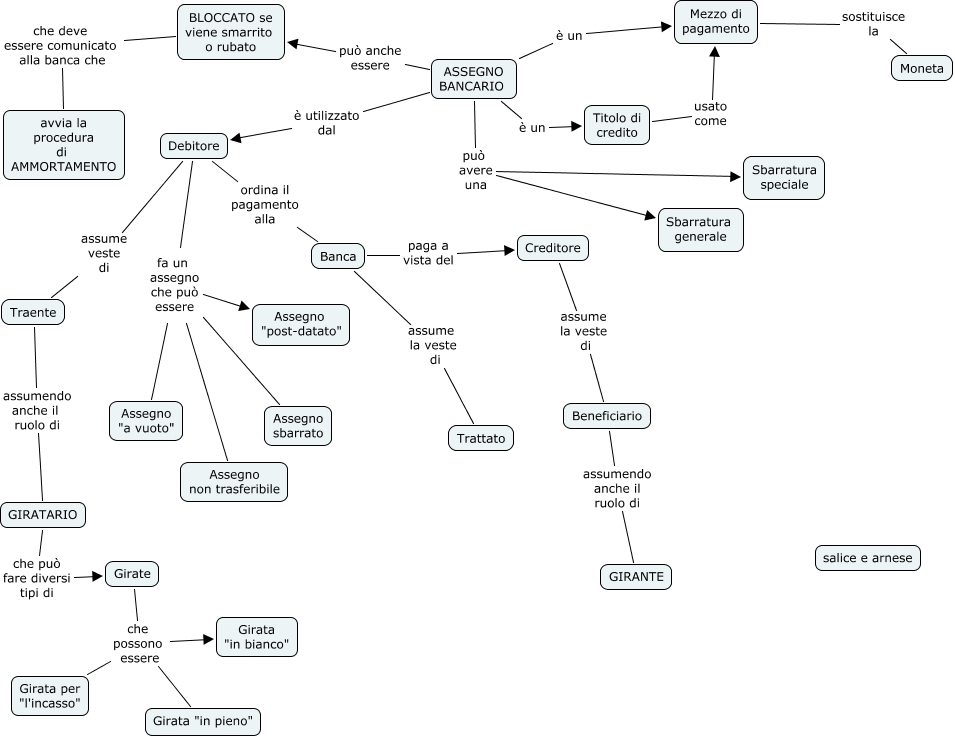 Questa Cmap, creata con IHMC CmapTools, contiene informazioni relative a: salice e arnese 3bl, Creditore assume la veste di Beneficiario, ASSEGNO BANCARIO è un Mezzo di pagamento, ASSEGNO BANCARIO è un Titolo di credito, ASSEGNO BANCARIO è utilizzato dal Debitore, GIRATARIO che può fare diversi tipi di Girate, Beneficiario assumendo anche il ruolo di GIRANTE, ASSEGNO BANCARIO può avere una Sbarratura speciale, ASSEGNO BANCARIO può anche essere BLOCCATO se viene smarrito o rubato, Debitore fa un assegno che può essere Assegno non trasferibile, Mezzo di pagamento sostituisce la Moneta, Debitore ordina il pagamento alla Banca, Girate che possono essere Girata "in pieno", Banca assume la veste di Trattato, Traente assumendo anche il ruolo di GIRATARIO, Debitore assume veste di Traente, Titolo di credito usato come Mezzo di pagamento, ASSEGNO BANCARIO può avere una Sbarratura generale, Girate che possono essere Girata "in bianco", Girate che possono essere Girata per "l'incasso", Debitore fa un assegno che può essere Assegno "post-datato"