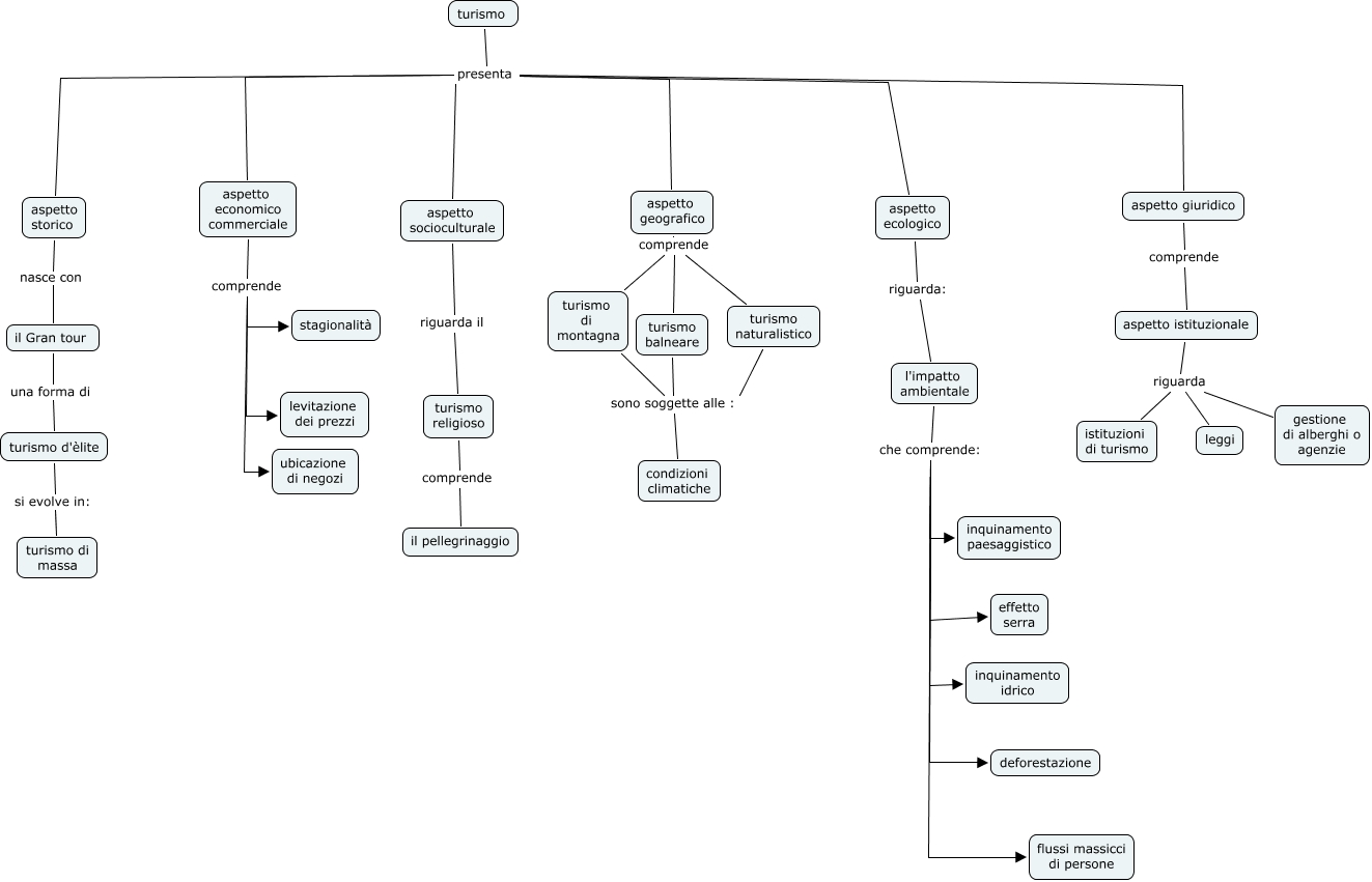 Questa Cmap, creata con IHMC CmapTools, contiene informazioni relative a: turismo pon divuolo troise pintore5bl, turismo presenta aspetto ecologico, aspetto geografico comprende turismo di montagna, turismo presenta aspetto storico, aspetto economico commerciale comprende levitazione dei prezzi, l'impatto ambientale che comprende: inquinamento idrico, l'impatto ambientale che comprende: flussi massicci di persone, l'impatto ambientale che comprende: deforestazione, aspetto geografico comprende turismo naturalistico, il Gran tour una forma di turismo d'èlite, aspetto istituzionale riguarda istituzioni di turismo, turismo religioso comprende il pellegrinaggio, turismo naturalistico sono soggette alle : condizioni climatiche, l'impatto ambientale che comprende: effetto serra, aspetto ecologico riguarda: l'impatto ambientale, turismo presenta aspetto geografico, turismo di montagna sono soggette alle : condizioni climatiche, aspetto storico nasce con il Gran tour, aspetto geografico comprende turismo balneare, turismo d'èlite si evolve in: turismo di massa, turismo presenta aspetto giuridico