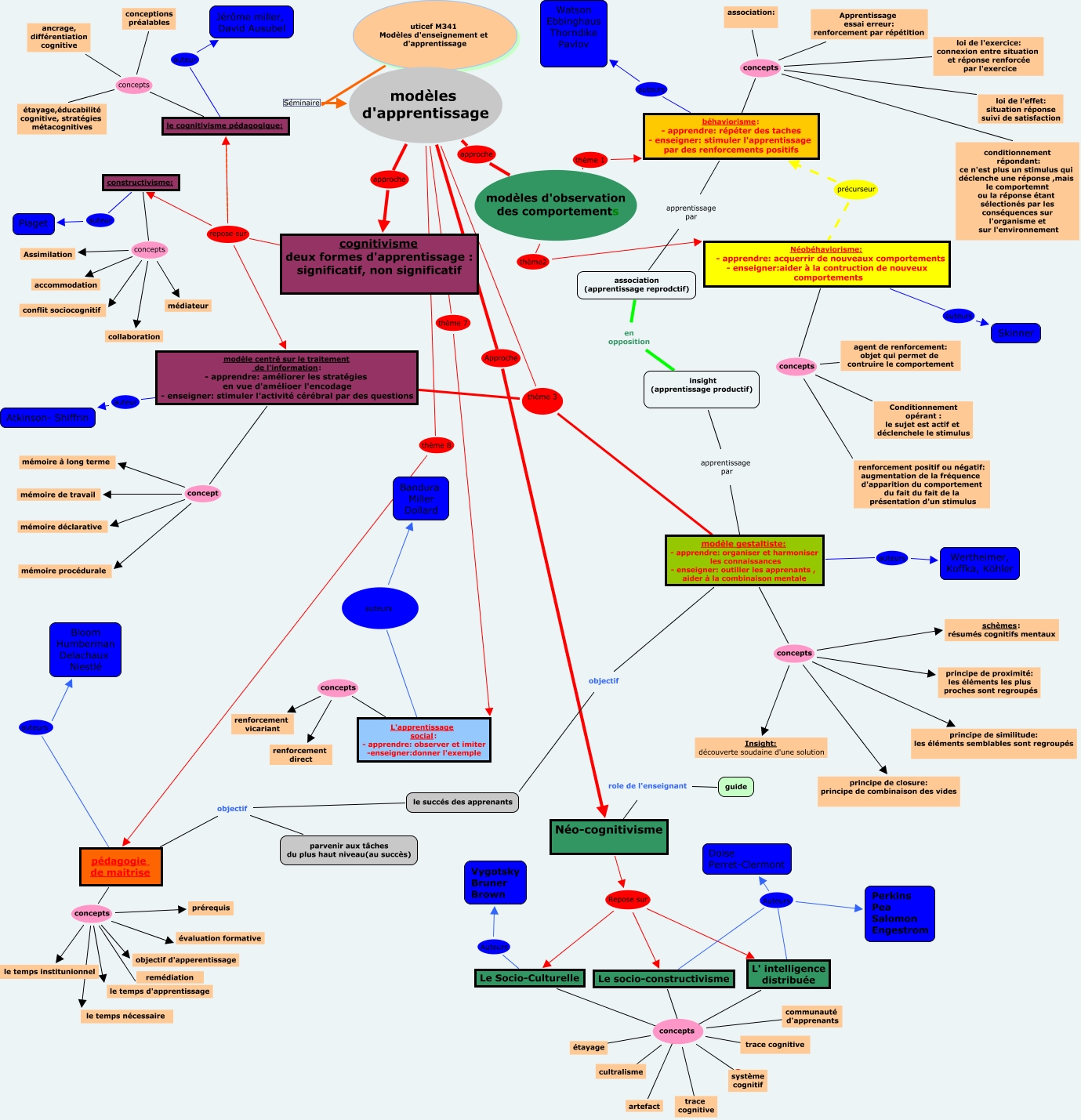 Cette carte de concepts créée avec IHMC CmapTools traite de: carte collective bien, concepts ???? communauté d'apprenants, Le socio-constructivisme ???? artefact, Le Socio-Culturelle Auteurs Vygotsky Bruner Brown, modèle centré sur le traitement de l'information: - apprendre: améliorer les stratégies en vue d'amélioer l'encodage - enseigner: stimuler l'activité cérébral par des questions concept mémoire déclarative, concepts trace cognitive, Néobéhaviorisme: - apprendre: acquerrir de nouveaux comportements - enseigner:aider à la contruction de nouveux comportements concepts agent de renforcement: objet qui permet de contruire le comportement, modèles d'apprentissage thème 3 modèle gestaltiste: - apprendre: organiser et harmoniser les connaissances - enseigner: outiller les apprenants , aider à la combinaison mentale, L'apprentissage social: - apprendre: observer et imiter -enseigner:donner l'exemple concepts renforcement direct, cognitivisme deux formes d'apprentissage : significatif, non significatif repose sur constructivisme:, concepts ???? trace cognitive, pédagogie de maitrise auteurs Bloom Humberman Delachaux Niestlé, modèle centré sur le traitement de l'information: - apprendre: améliorer les stratégies en vue d'amélioer l'encodage - enseigner: stimuler l'activité cérébral par des questions concept mémoire procédurale, pédagogie de maitrise concepts le temps d'apprentissage, modèles d'observation des comportements thème 1 béhaviorisme: - apprendre: répéter des taches - enseigner: stimuler l'apprentissage par des renforcements positifs, Néobéhaviorisme: - apprendre: acquerrir de nouveaux comportements - enseigner:aider à la contruction de nouveux comportements concepts renforcement positif ou négatif: augmentation de la fréquence d'apparition du comportement du fait du fait de la présentation d'un stimulus, modèle centré sur le traitement de l'information: - apprendre: améliorer les stratégies en vue d'amélioer l'encodage - enseigner: stimuler l'activité cérébral par des questions concept mémoire à long terme, modèle gestaltiste: - apprendre: organiser et harmoniser les connaissances - enseigner: outiller les apprenants , aider à la combinaison mentale objectif le succés des apprenants, constructivisme: concepts accommodation, béhaviorisme: - apprendre: répéter des taches - enseigner: stimuler l'apprentissage par des renforcements positifs concepts association:, pédagogie de maitrise objectif parvenir aux tâches du plus haut niveau(au succès)