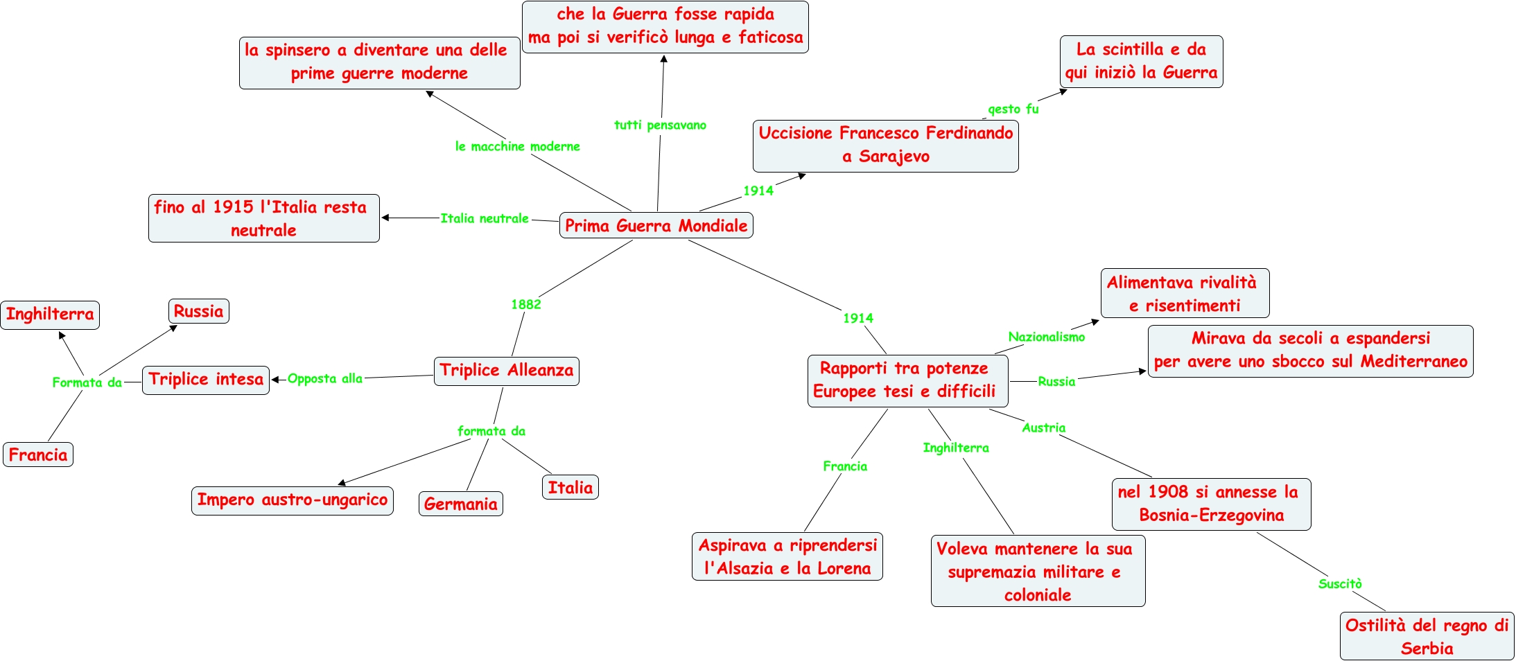 Questa Cmap, creata con IHMC CmapTools, contiene informazioni relative a: mappa esame christian storia, Triplice intesa Formata da Russia, Prima Guerra Mondiale 1882 Triplice Alleanza, Prima Guerra Mondiale 1914 Uccisione Francesco Ferdinando a Sarajevo, Rapporti tra potenze Europee tesi e difficili Inghilterra Voleva mantenere la sua supremazia militare e coloniale, Rapporti tra potenze Europee tesi e difficili Nazionalismo Alimentava rivalità e risentimenti, Rapporti tra potenze Europee tesi e difficili Francia Aspirava a riprendersi l'Alsazia e la Lorena, Triplice intesa Formata da Inghilterra, Prima Guerra Mondiale le macchine moderne la spinsero a diventare una delle prime guerre moderne, Triplice Alleanza Opposta alla Triplice intesa, Rapporti tra potenze Europee tesi e difficili Austria nel 1908 si annesse la Bosnia-Erzegovina, Triplice Alleanza formata da Impero austro-ungarico, Uccisione Francesco Ferdinando a Sarajevo qesto fu La scintilla e da qui iniziò la Guerra, nel 1908 si annesse la Bosnia-Erzegovina Suscitò Ostilità del regno di Serbia, Prima Guerra Mondiale Italia neutrale fino al 1915 l'Italia resta neutrale, Prima Guerra Mondiale tutti pensavano che la Guerra fosse rapida ma poi si verificò lunga e faticosa, Triplice Alleanza formata da Italia, Prima Guerra Mondiale 1914 Rapporti tra potenze Europee tesi e difficili, Triplice Alleanza formata da Germania, Rapporti tra potenze Europee tesi e difficili Russia Mirava da secoli a espandersi per avere uno sbocco sul Mediterraneo, Triplice intesa Formata da Francia
