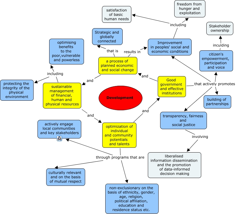 This Concept Map, created with IHMC CmapTools, has information related to: Mac's Development Philosophy, sustainable management of financial, human and physical resources including protecting the integrity of the physical environment, transparency, fairness and social justice involving liberalised information dissemination and the promotion of data-informed decision making, citizen's empowerment, participation and voice inculding Stakeholder ownership, a process of planned economic and social change and sustainable management of financial, human and physical resources, optimization of individual and community potentials and talents through programs that are non-exclusionary on the basis of ethnicity, gender, age, religion, political affiliation, education and residence status etc., sustainable management of financial, human and physical resources and optimization of individual and community potentials and talents, Improvement in peoples' social and economic conditions including freedom from hunger and exploitation, Good government and effective institutions that actively promotes transparency, fairness and social justice, sustainable management of financial, human and physical resources including optimising benefits to the poor,vulnerable and powerless, Good government and effective institutions and a process of planned economic and social change, Good government and effective institutions that actively promotes Improvement in peoples' social and economic conditions, Improvement in peoples' social and economic conditions including satisfaction of basic human needs, optimization of individual and community potentials and talents through programs that are actively engage local communities and key stakeholders, Good government and effective institutions that actively promotes citizen's empowerment, participation and voice, optimization of individual and community potentials and talents and Good government and effective institutions, a process of planned economic and social change results in Improvement in peoples' social and economic conditions, optimization of individual and community potentials and talents through programs that are culturally relevant and on the basis of mutual respect, Good government and effective institutions that actively promotes building of partnerships, a process of planned economic and social change that is Strategic and globally connected